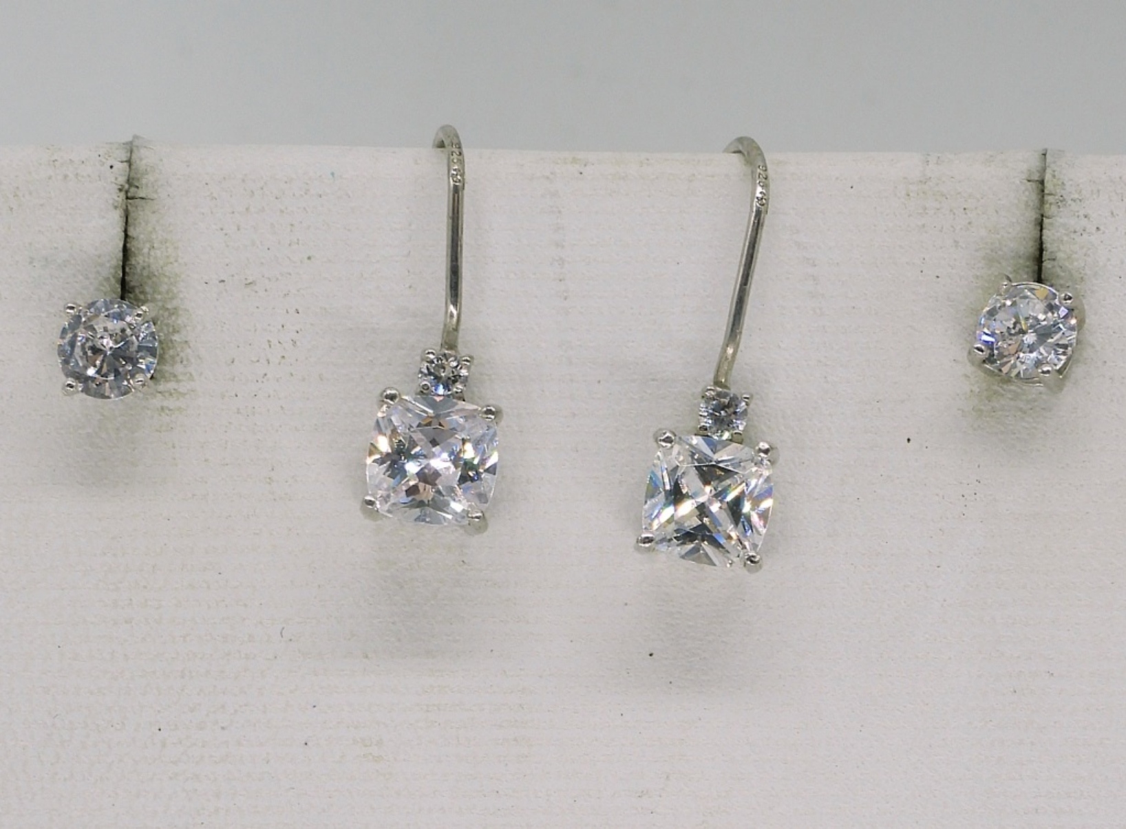 Sterling Pandora necklace, 30″ long. Simulated diamond bracelet, 7″ long. Four sterling rings with simulated diamonds, size 6 & 8. Two pair of pierced earrings. (19 dwt) (6x4x2)