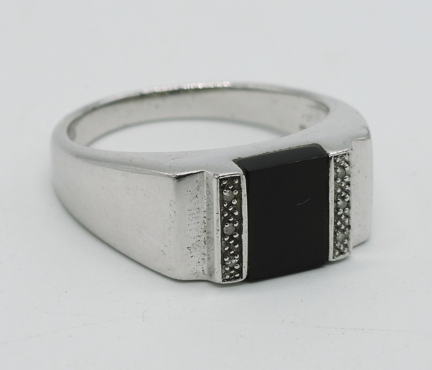 Sterling and Black Onyx. Necklace, 24″. Hinged Taxco Black Onyx Bracelet, Missing one gem. Marked “TN-62 Mexico 925”. Men’s Ring size 13. (53.8 dwt) (6x4x2)