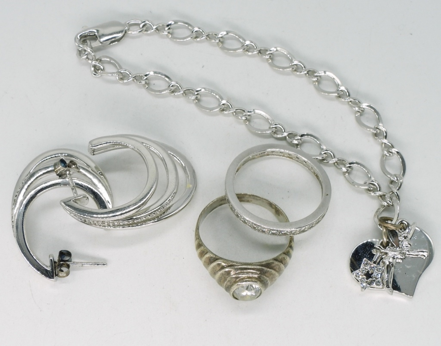 Sterling Simulated Diamond Jewelry. Two rings, sizes 8 & 9. Sterling simulated diamond pierced earrings, 1 1/4″ long. Tinkerbell bracelet, 8″ long. (16.8 dwt)