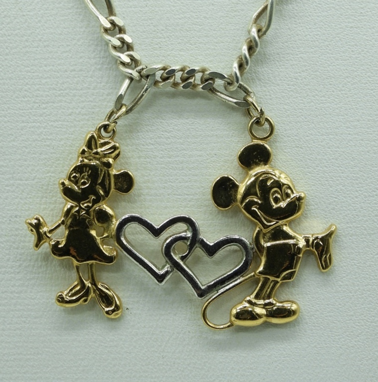 Gold Tone Sterling, two necklaces 18-20″ chains. Mickey & Minnie Mouse pendant, 1″ long. Heart shaped gold tone 925 pierced earrings. (11.3 dwt)