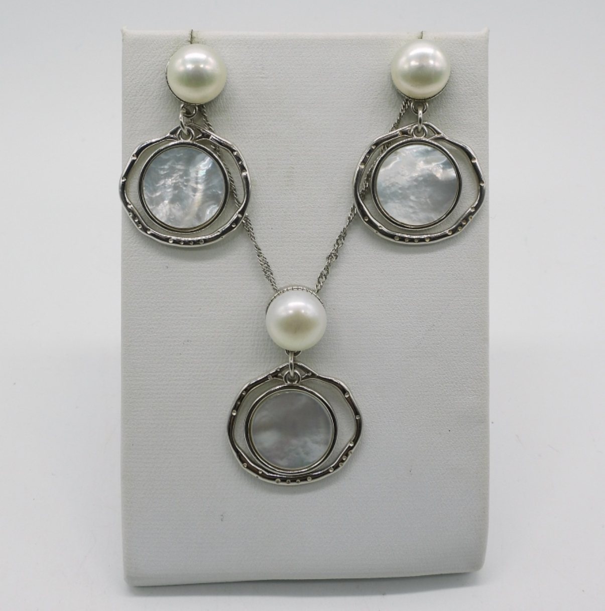 Pearls and Mother of pearl, in sterling. Necklace is 20″. Pierced earrings are 1″. (8.4 dwt) (6x4x2)