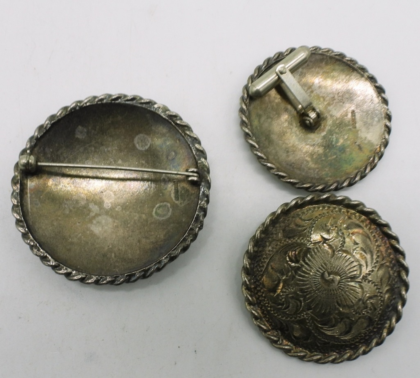 Vintage sterling, round cufflinks, 1.5″. Similar sterling round etched brooch, 2″. (19.7 dwt) (6x4x2)