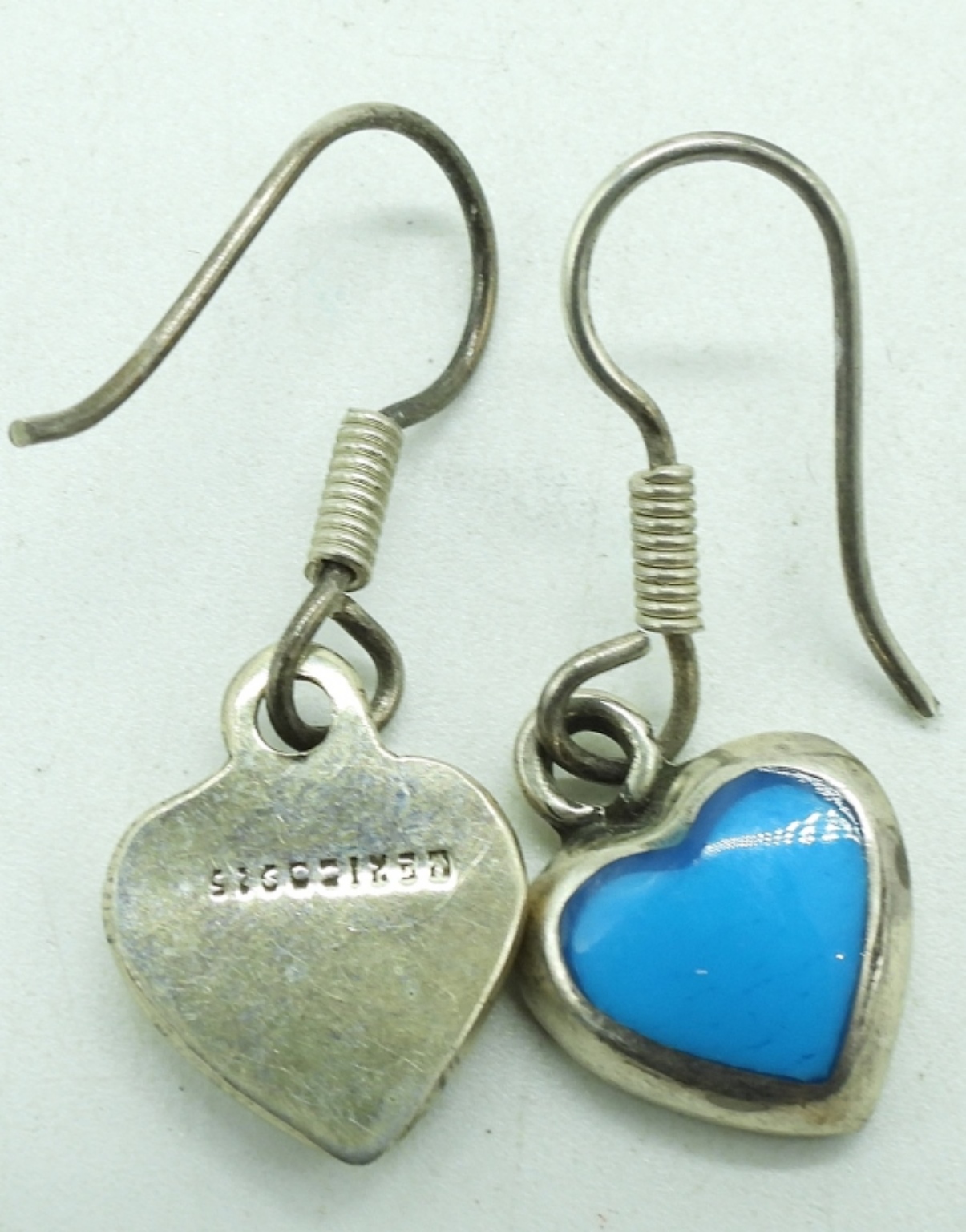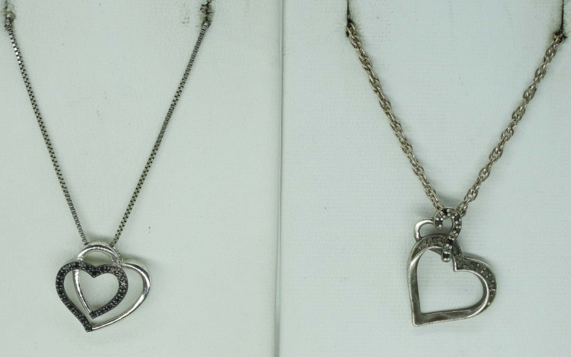 Two sterling heart shaped necklaces, 18″ & 20″. Heart / Cross pendant with gemstones, 1″ long. Heart pin 1.5″. Pierced earrings, 1″ long. (13 dwt) (6x4x2)