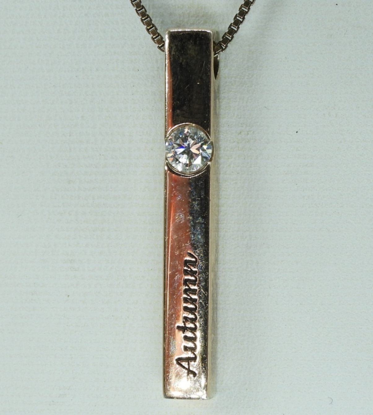 Necklace is a gold tone sterling with a moissanite gemstone and “Autumn” engraved. On a gold tone 18″ chain. Bracelets are 7″ and 10″. Two rings, size 7. (16.6 dwt) (6x4x2)