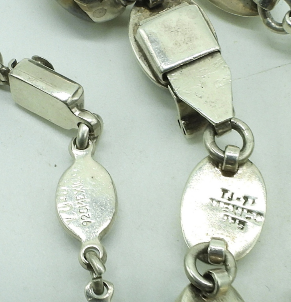 Two sterling bracelets, various gemstones. Larger bracelet is Taxco “TJ-71″, 7″ long. Clasp sticks, but works. Smaller bracelet is Mexico 925, with black obsidian, 7.5” long. (32 dwt) (6x4x2)