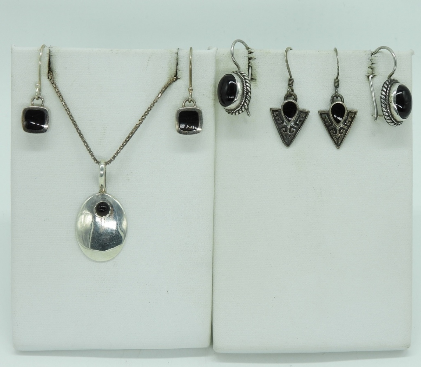 3 pair of sterling pierced black onyx earrings and one sterling black onyx necklace, 16″ long. (8.7 dwt)