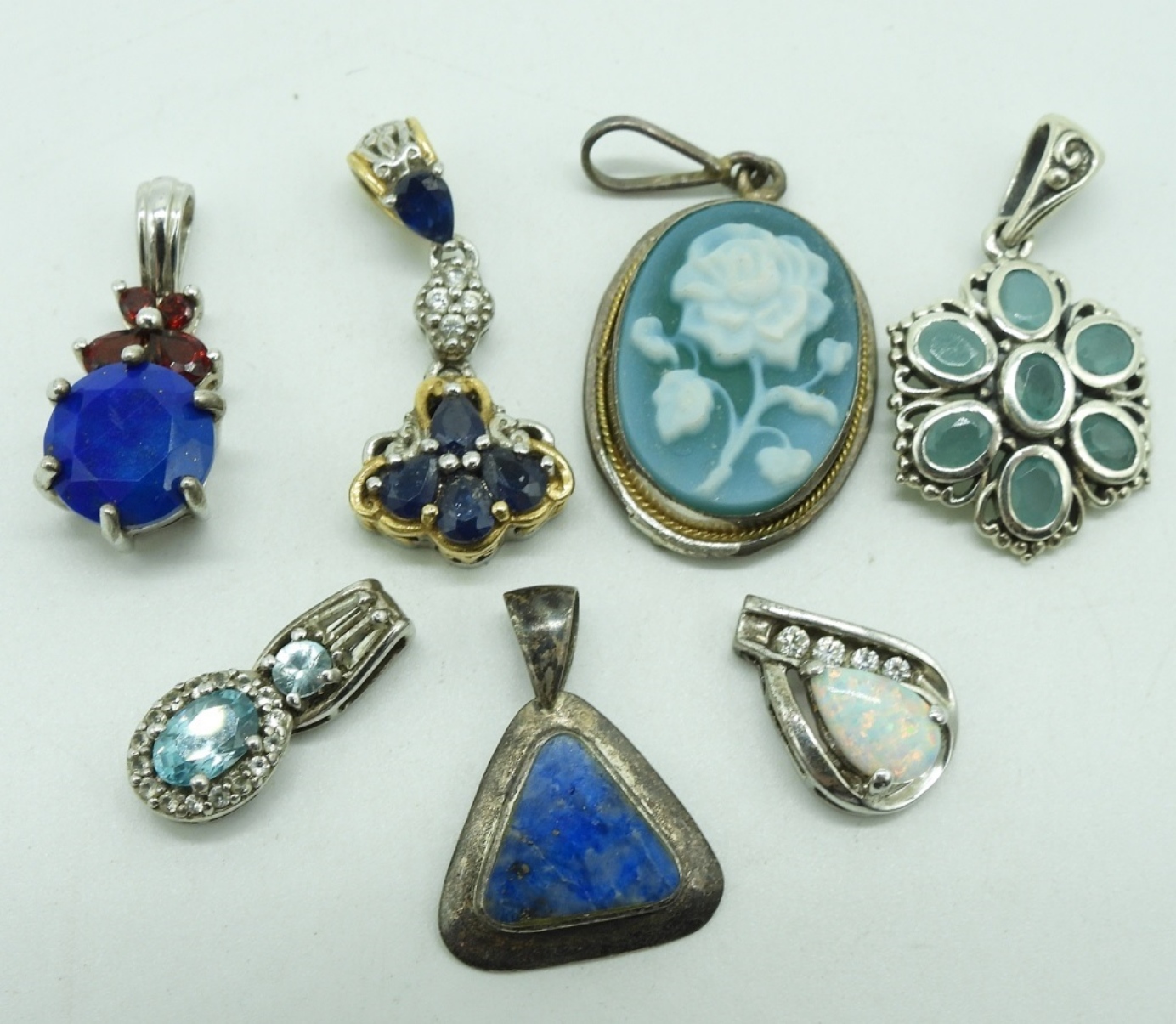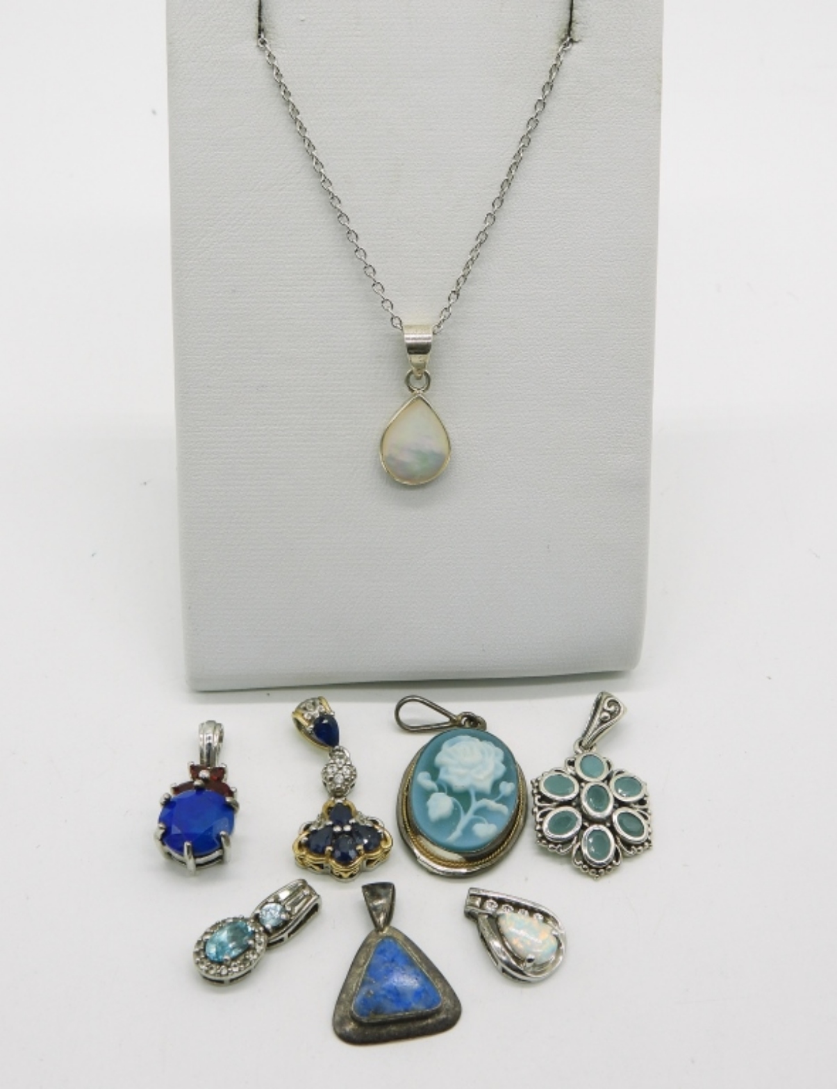 8 sterling modern and vintage gemstone pendants, one sterling chain 18″ long. See photos (8.8 dwt)
