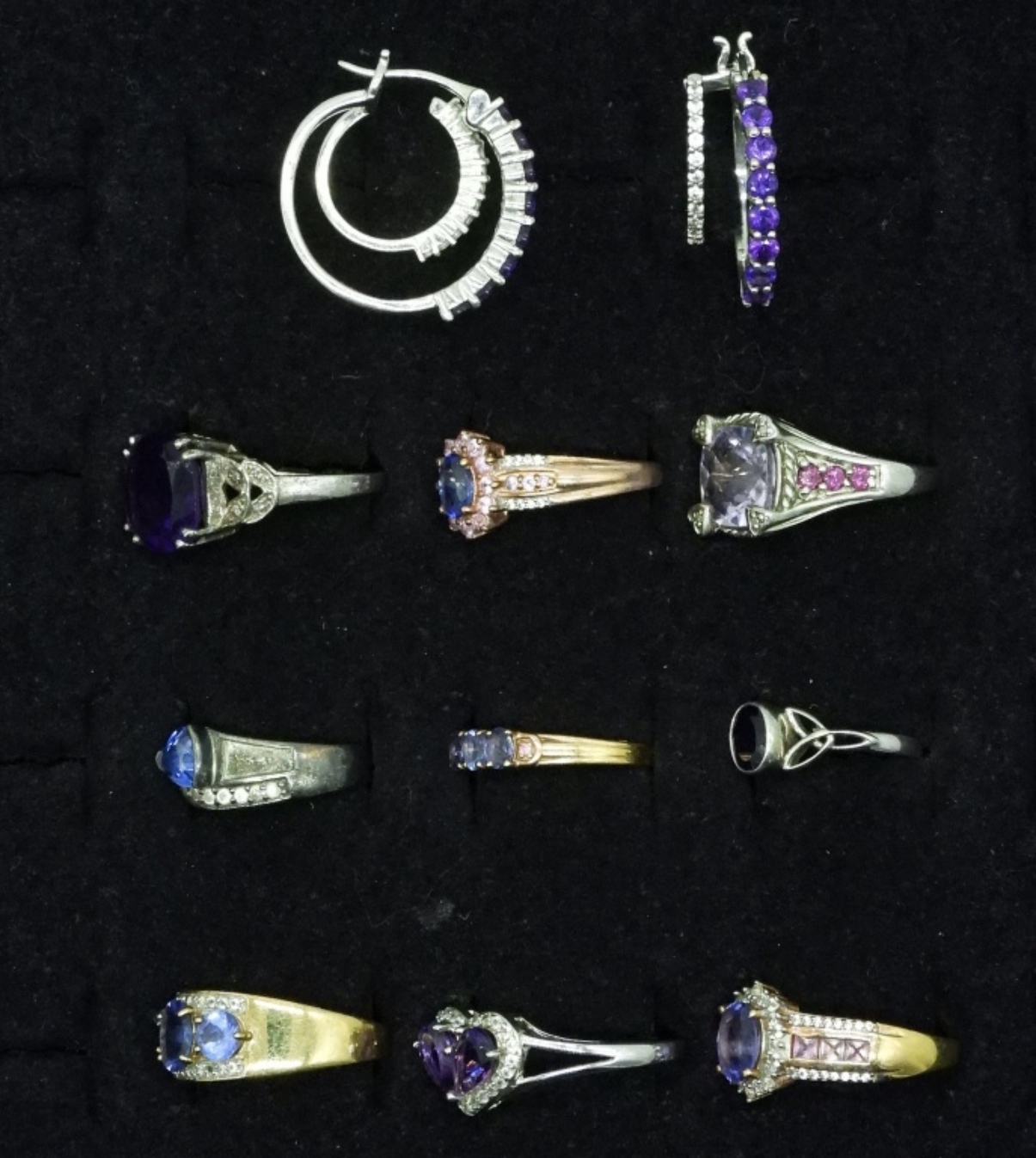 Nine sterling amethyst and other purple gemstone rings, sizes 6-10.5. One pair of sterling pierced earrings with amethyst & Simulated diamond gemstones. (25 dwt) (6x4x2)