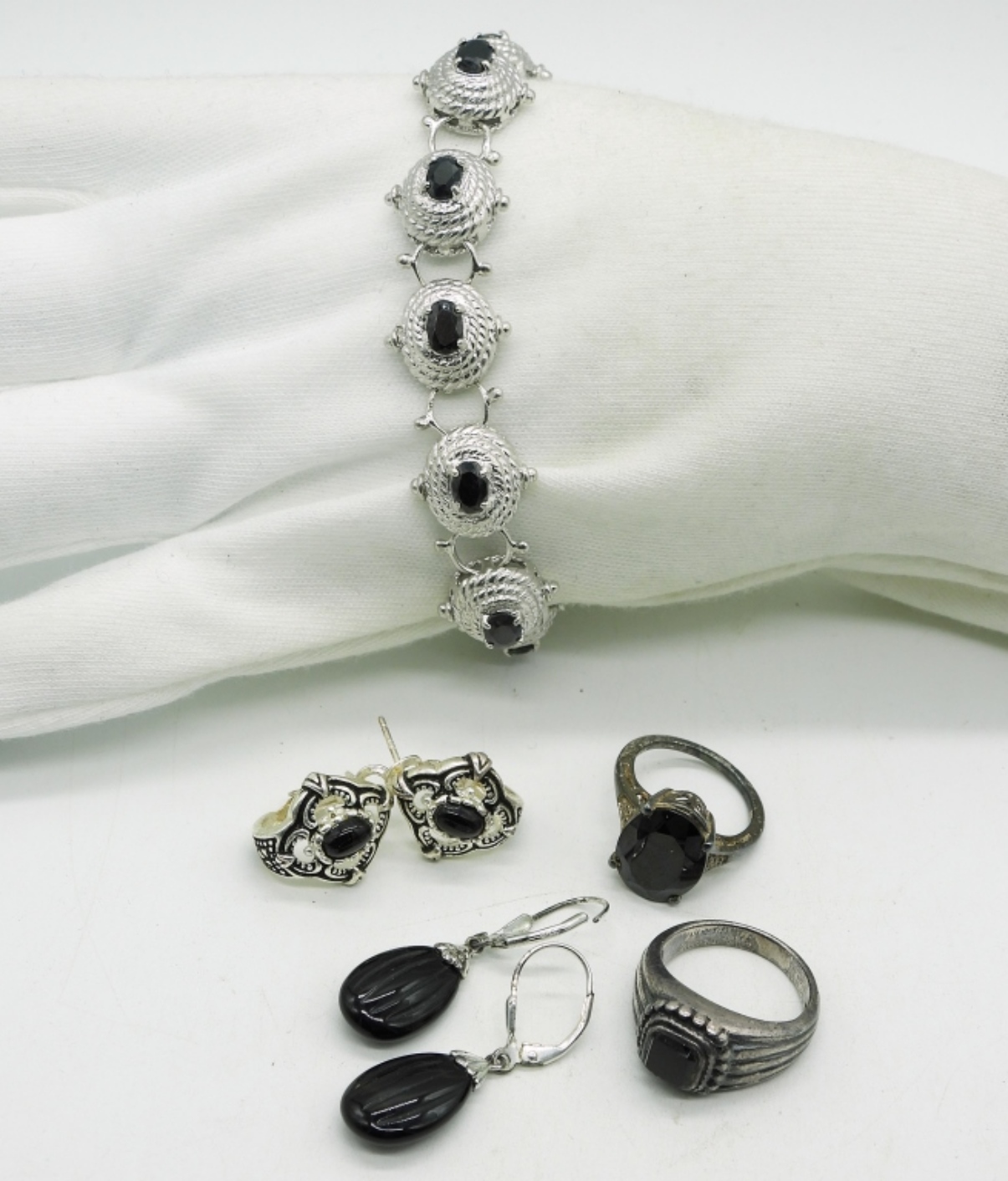 Black Onyx or Spinel sterling jewelry. Bracelet is 8″. Two pair of pierced earrings. Two rings, sizes 5 & 6.5 (28 dwt) (6x4x2)