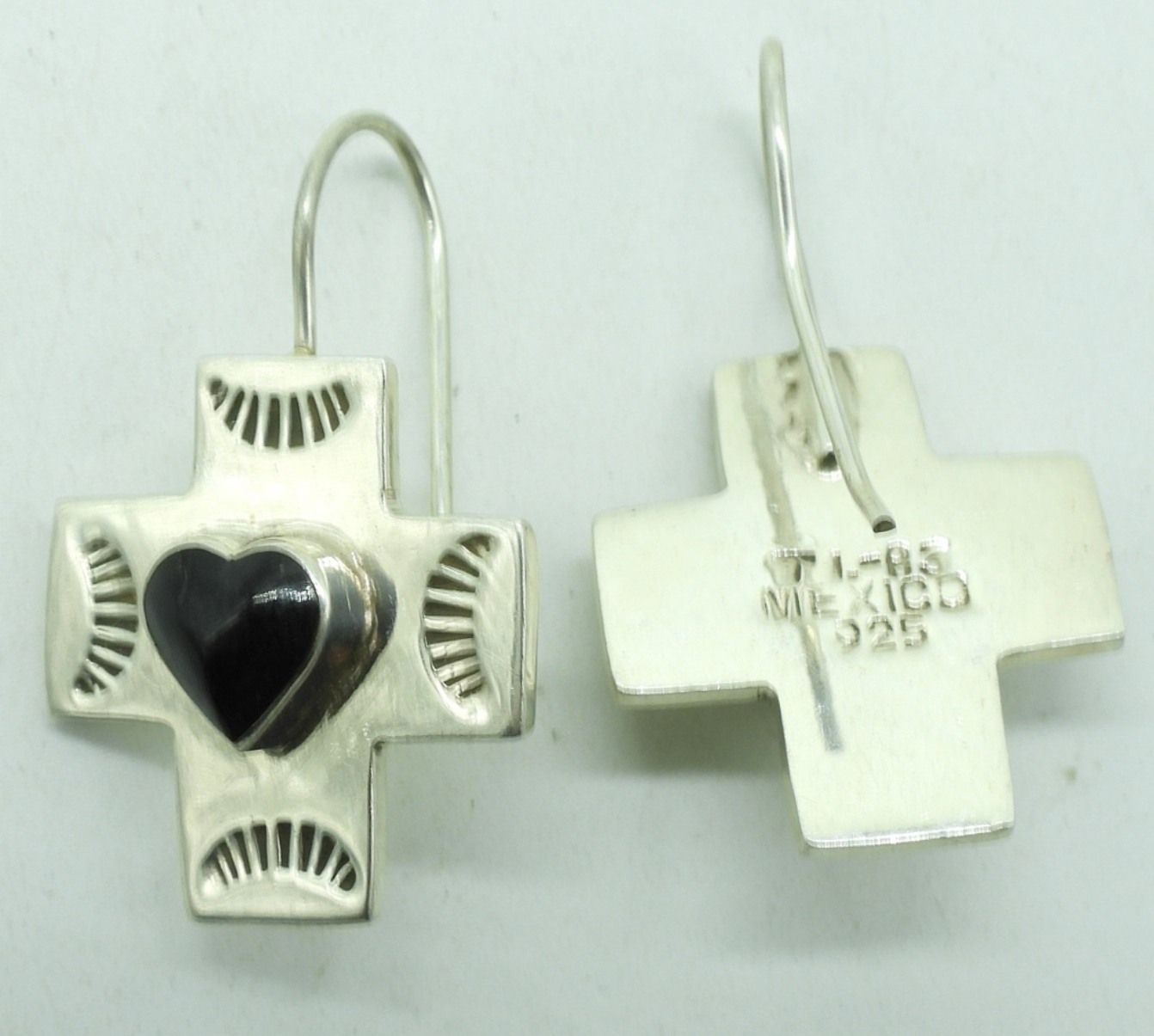 Sterling and Black Onyx. Necklace is 20″ long, pendant is 2″ long. Two pair of sterling pierced earrings, both 1.5″ long. (17.8 dwt) (6x4x2)