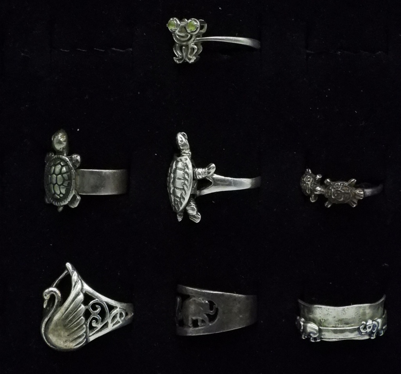 Seven sterling rings, three with turtles, two with elephants, one swan and one frog. Sizes 4.5 – 7 (18 dwt)