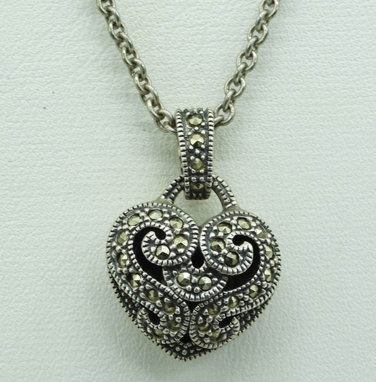 Seven sterling heart shaped pendants, all around 1″ long. One sterling chain, 16″ long. (16 dwt)