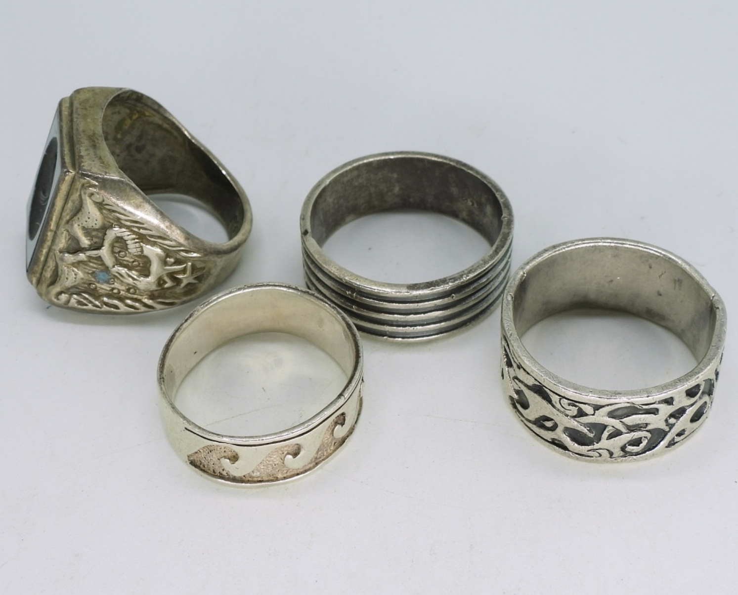 Four sterling mens fashion rings, sizes 9-12. (21 dwt)