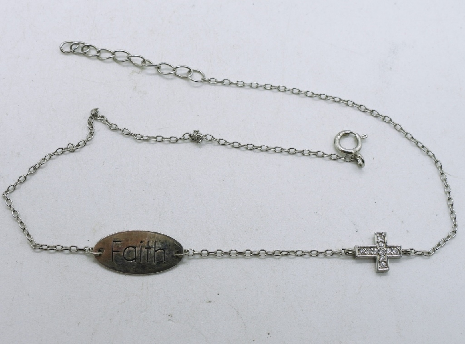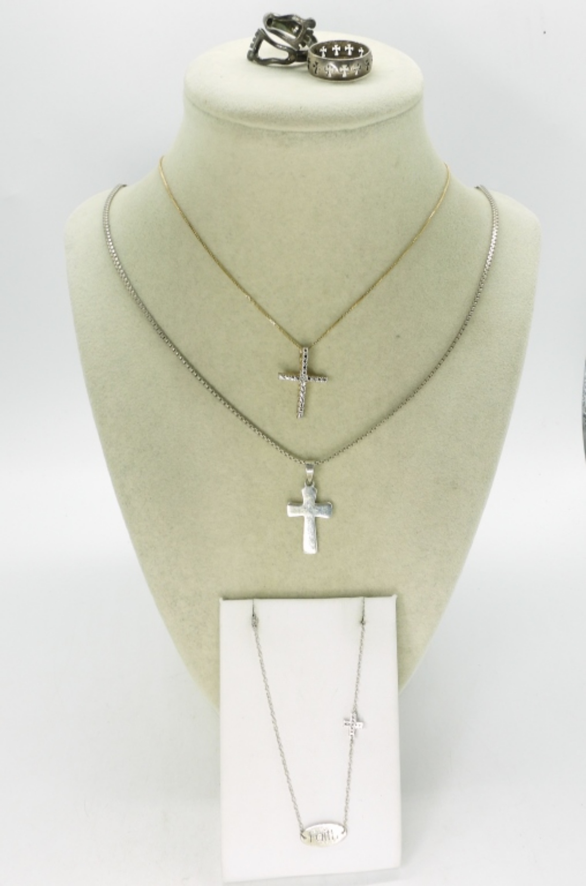 Two sterling cross pendant necklaces, 18-20″. Faith cross sterling anklet, 10″. Two rings, size 7 (13 dwt) (6x4x2)