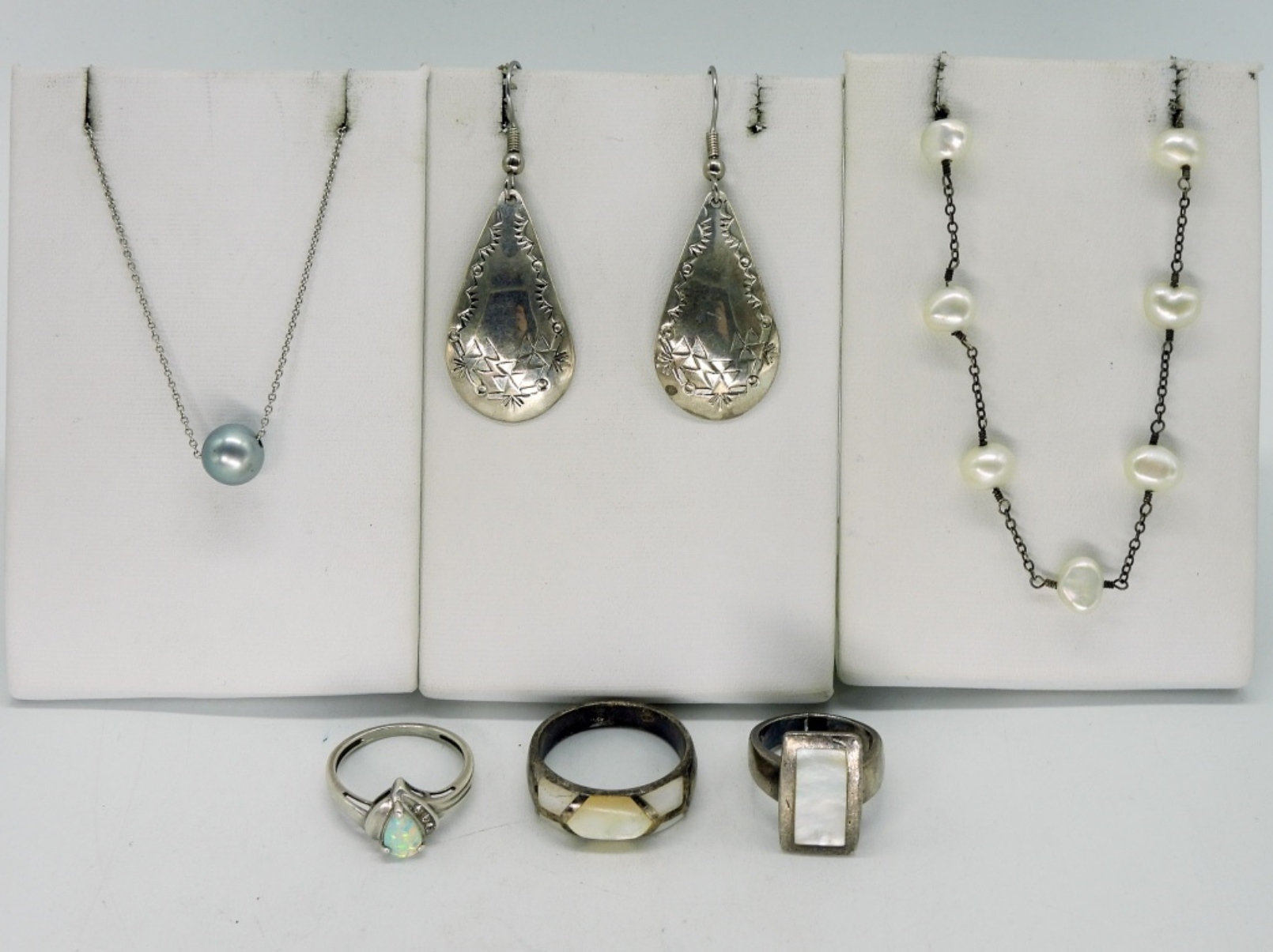 Two sterling pearl necklaces, 16″ long. Three sterling rings with opal and mother of pearl gemstones. Sizes 4.5, 7, 9.5. One pair pierced sterling earrings, 2″ long. (17 dwt) (6x4x2)