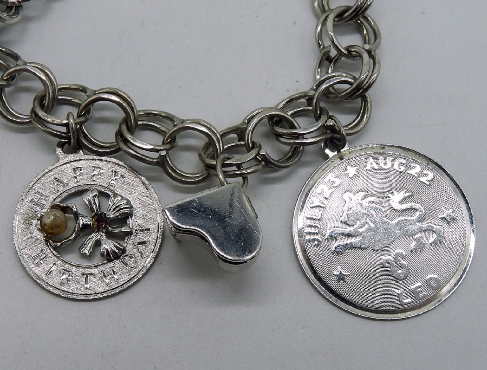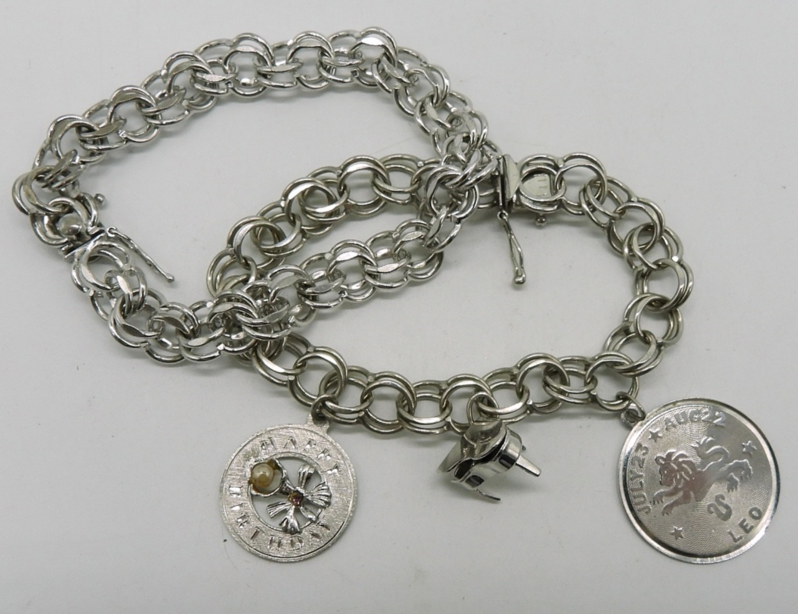 Two vintage sterling charm bracelets, 7.5″ long. One has three vintage sterling charms. (24 dwt)
