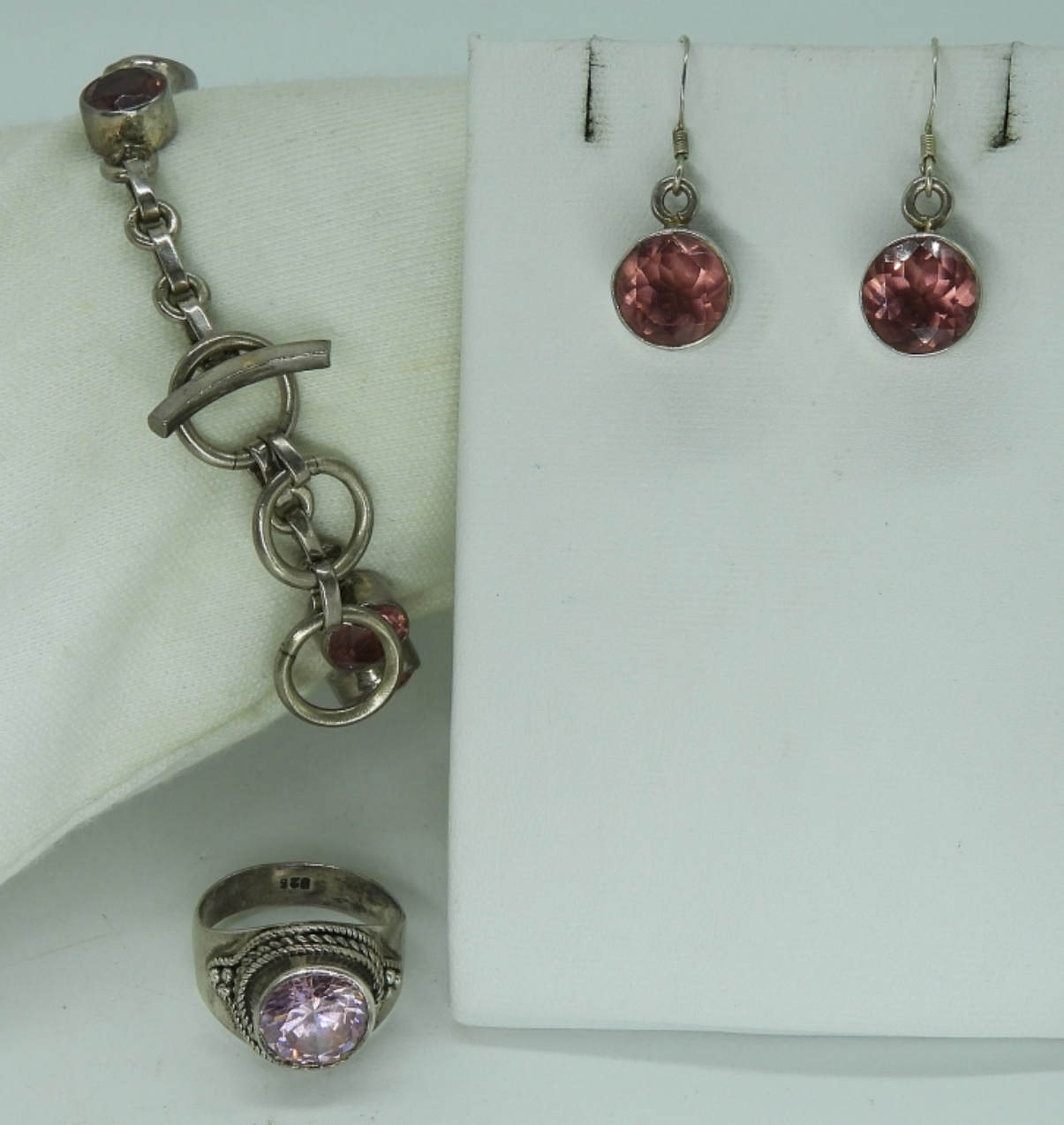 Three piece sterling pink gemstone set. Pierced earrings, 1″ long. Adjustable 6.5-8″ bracelet. Ring size 8.5 (17 dwt)