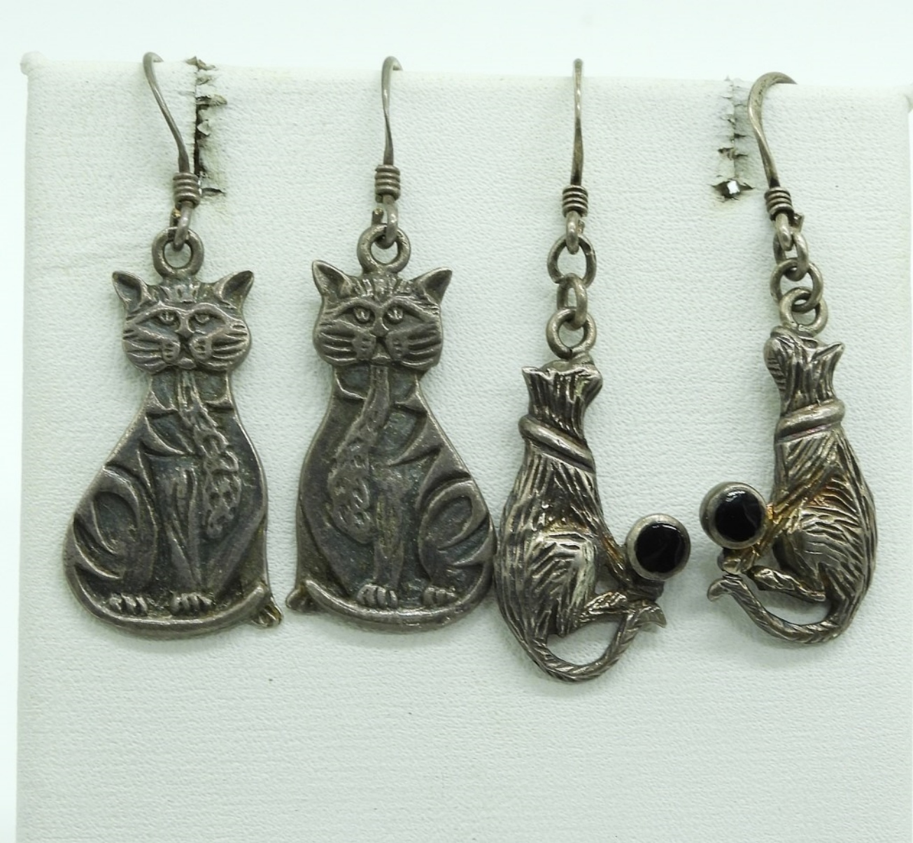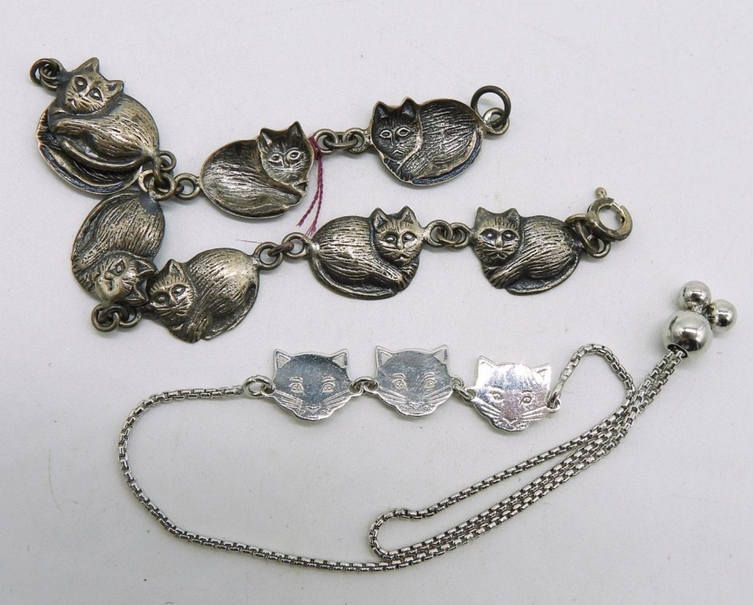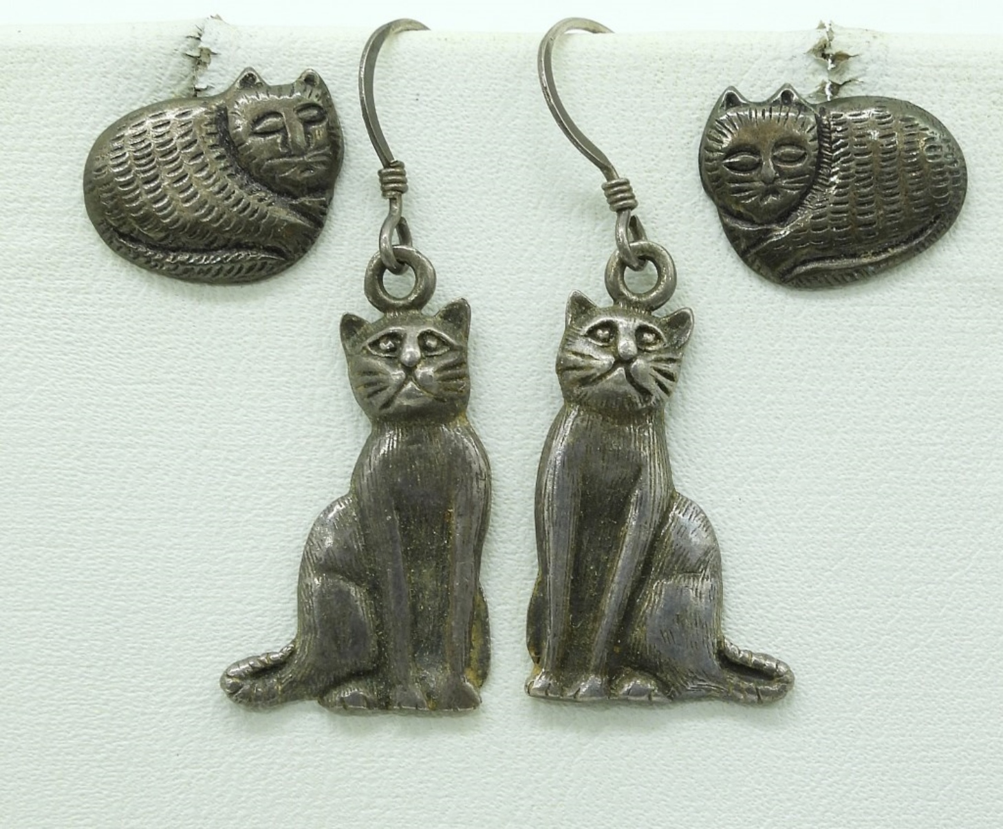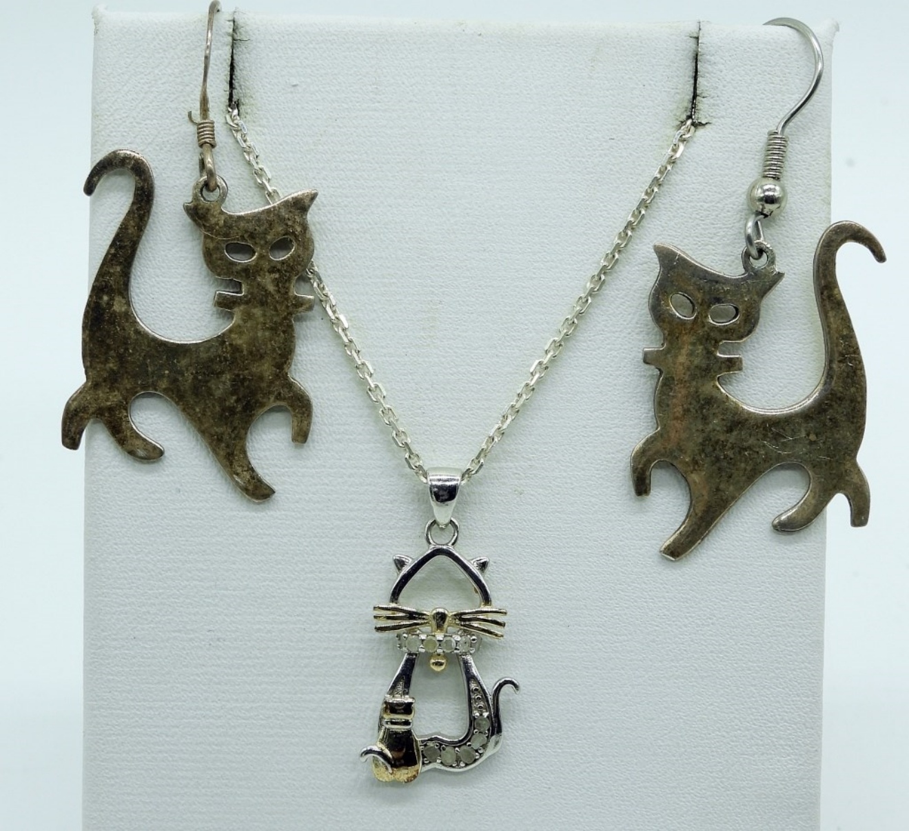 Eight sterling pieces of cat shaped jewelry. Two bracelets, 7″ & 10″. Five sterling pierced earrings. Necklace is 20″ long. (21 dwt)