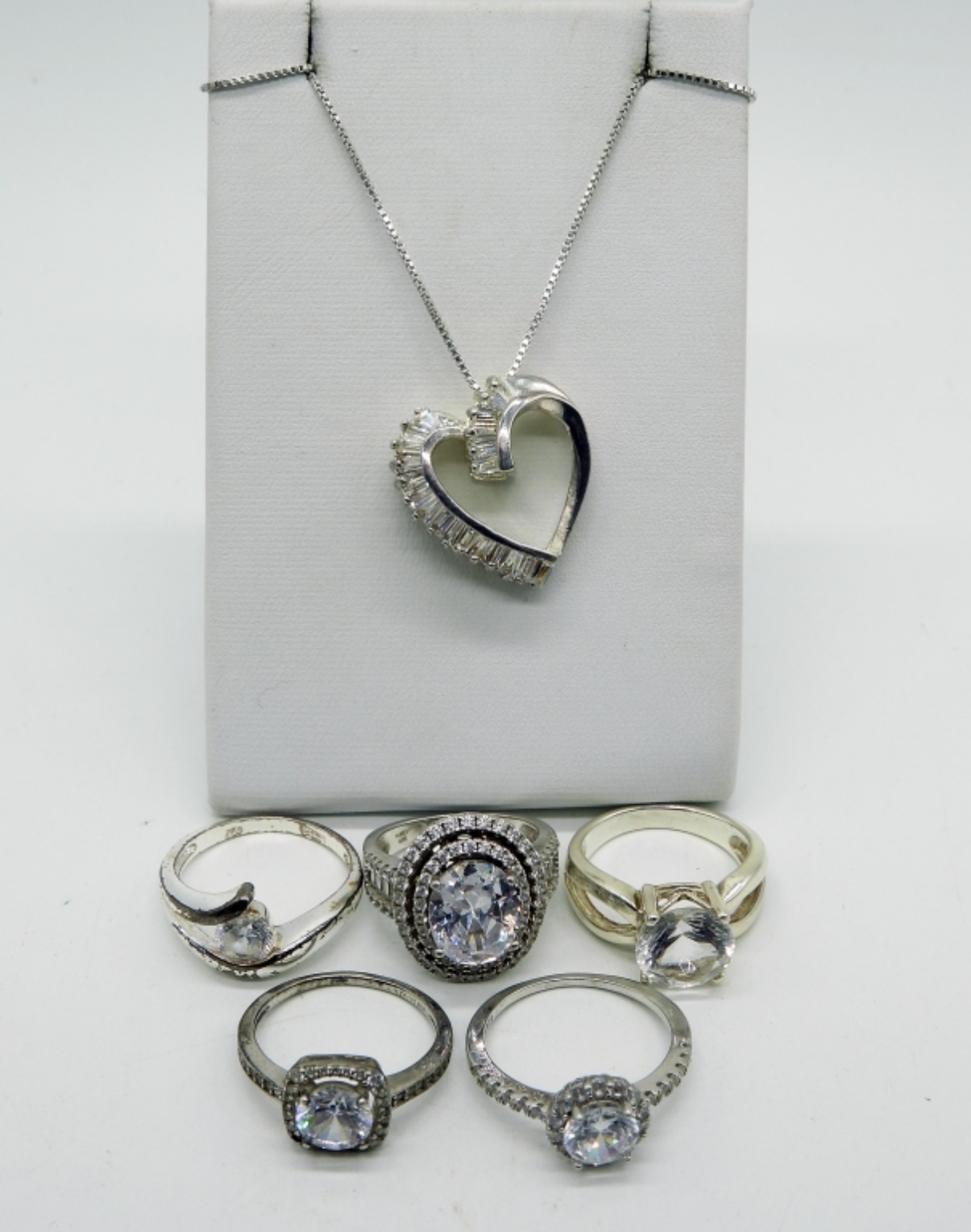Five sterling bridal style rings (simulated diamond, cz & glass), sizes 6, 7, 8. Sterling heart shaped pendant, 1″ long, on a 18″ sterling chain. (17.5 dwt)