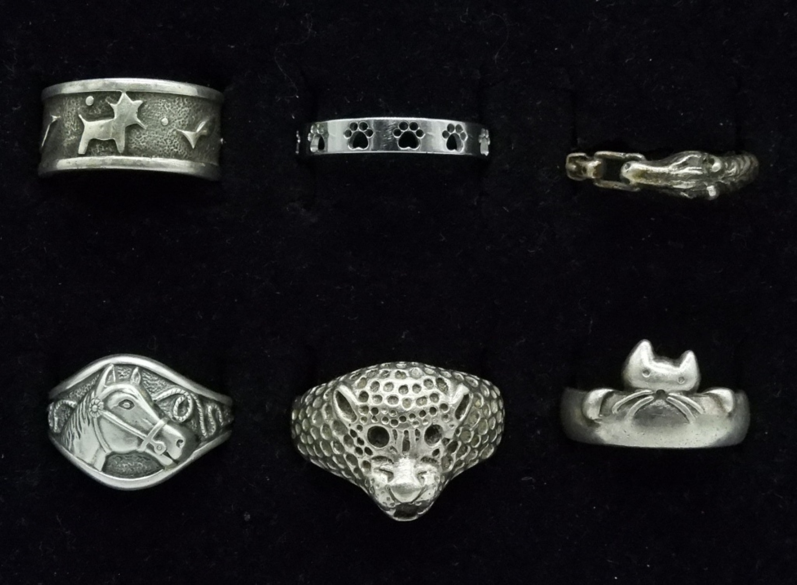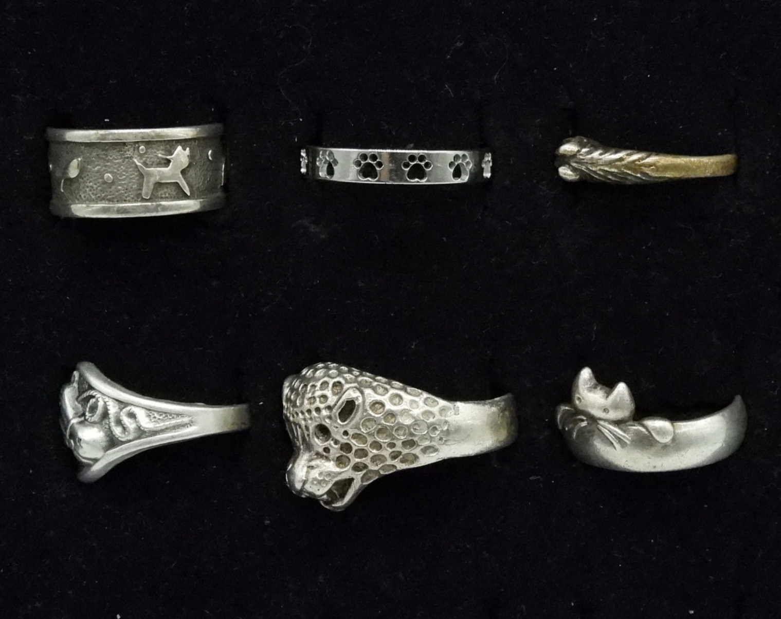 Six sterling rings, animal shaped. Sizes 7-11 (19 dwt)