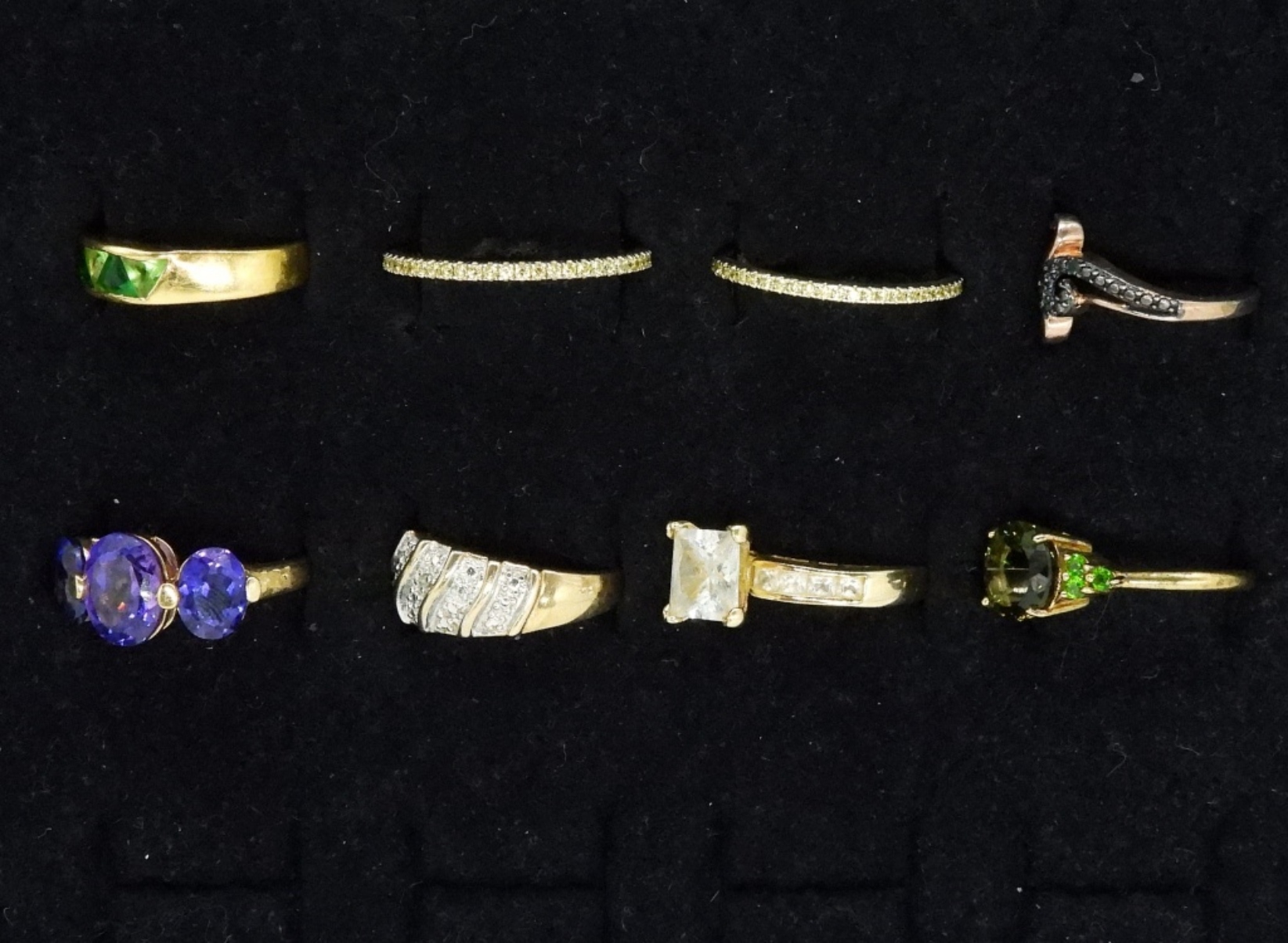 Eight gold tone sterling rings, sizes 6, 7, 8, 10. (15.8 dwt)