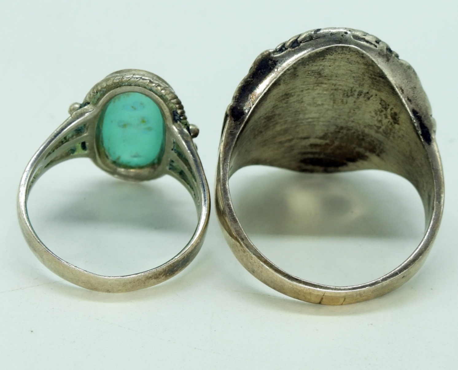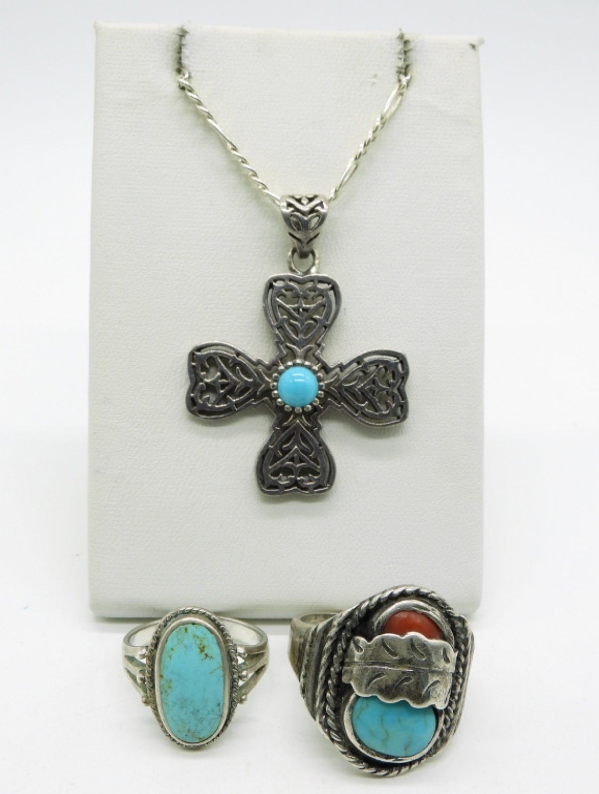 Two sterling rings with gorgeous turquoise gemstones, sizes 8 & 12.5. Cross necklace with turquoise gemstone, 16″ long chain. (20.5 dwt)