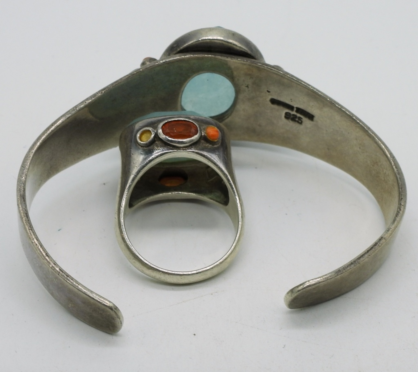 Sterling, Green Chalcedony matching cuff bracelet and ring, size 8. (26 dwt)