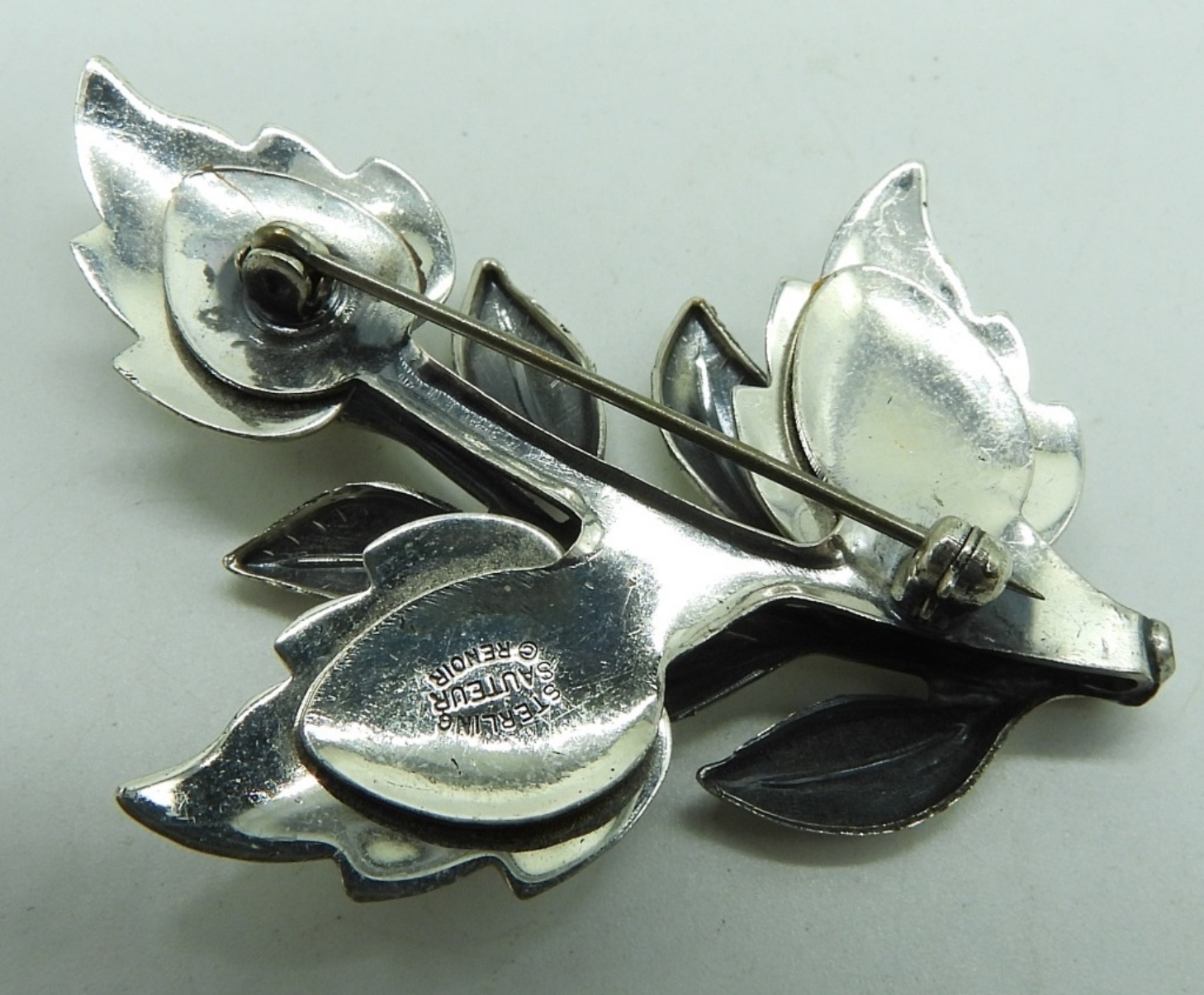 Sauteur Renoir brand leaf brooch, 2″ x 2 1/4″. Horse brooch, 3 1/4″ x 2″. (18.7 dwt)