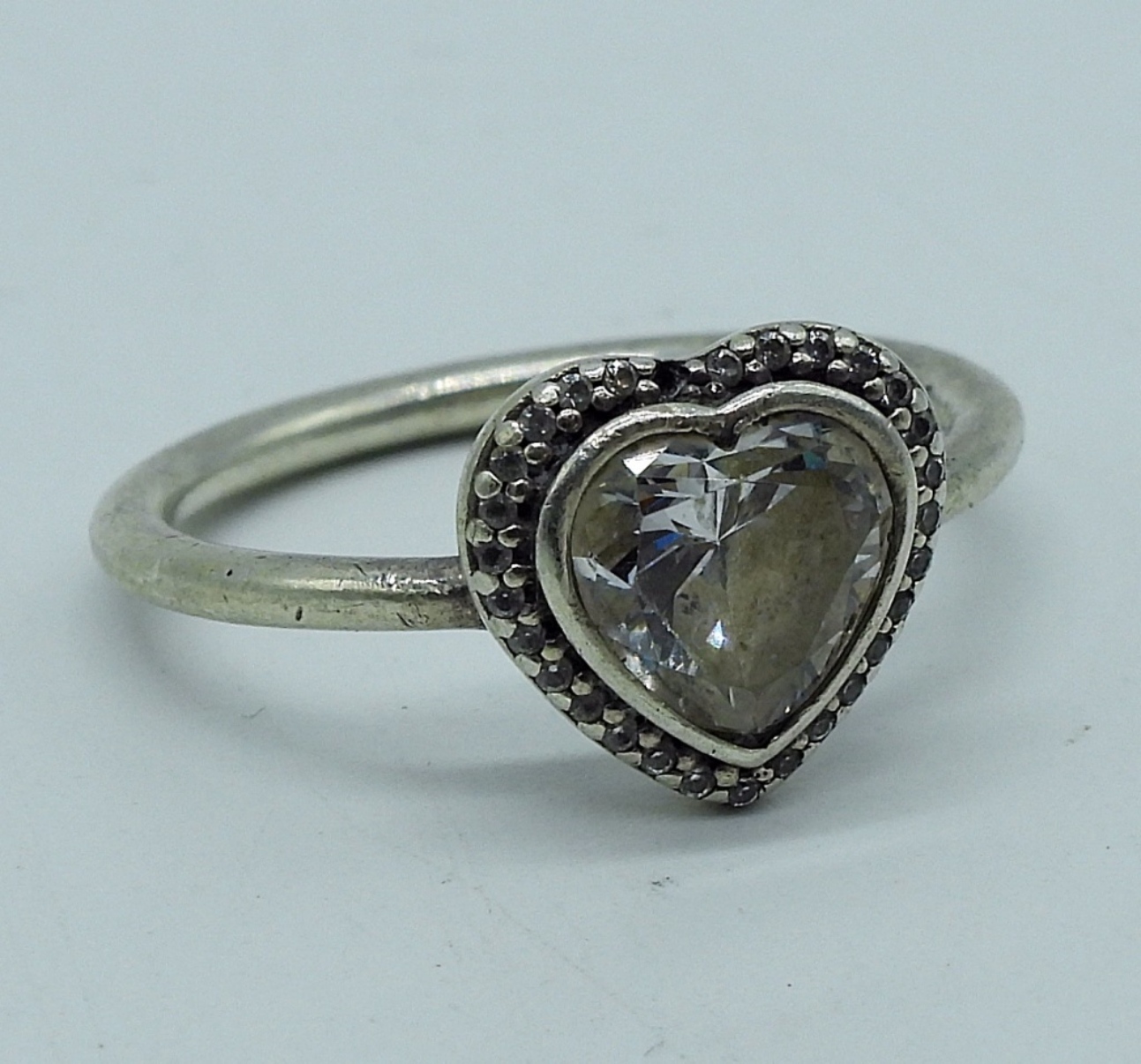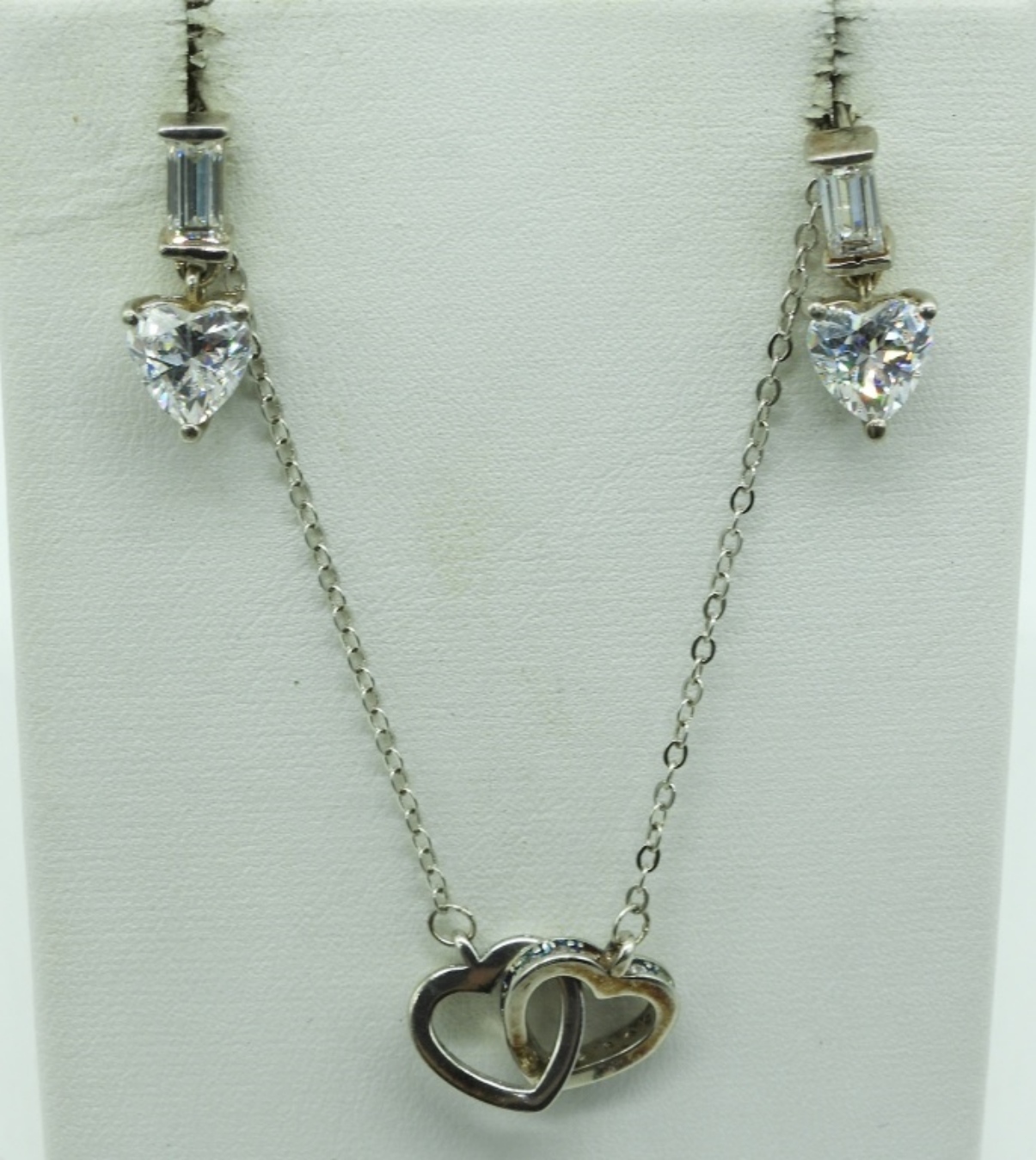 Simulated diamonds, necklace 18″ long. Two pair of pierced earrings. Ring size 7. (10 dwt)