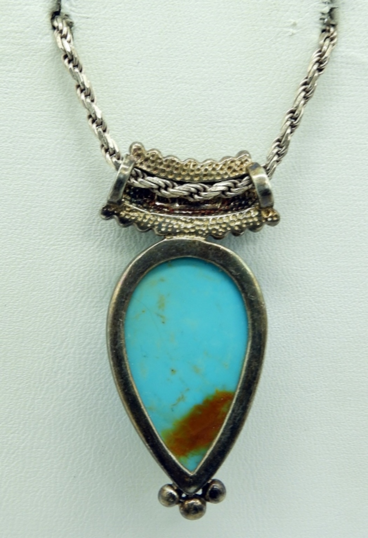 Pretty turquoise pendant, 2″ long on a 18″ sterling chain. Two sterling turquoise rings, sizes 6-6.5 (17.6 dwt)