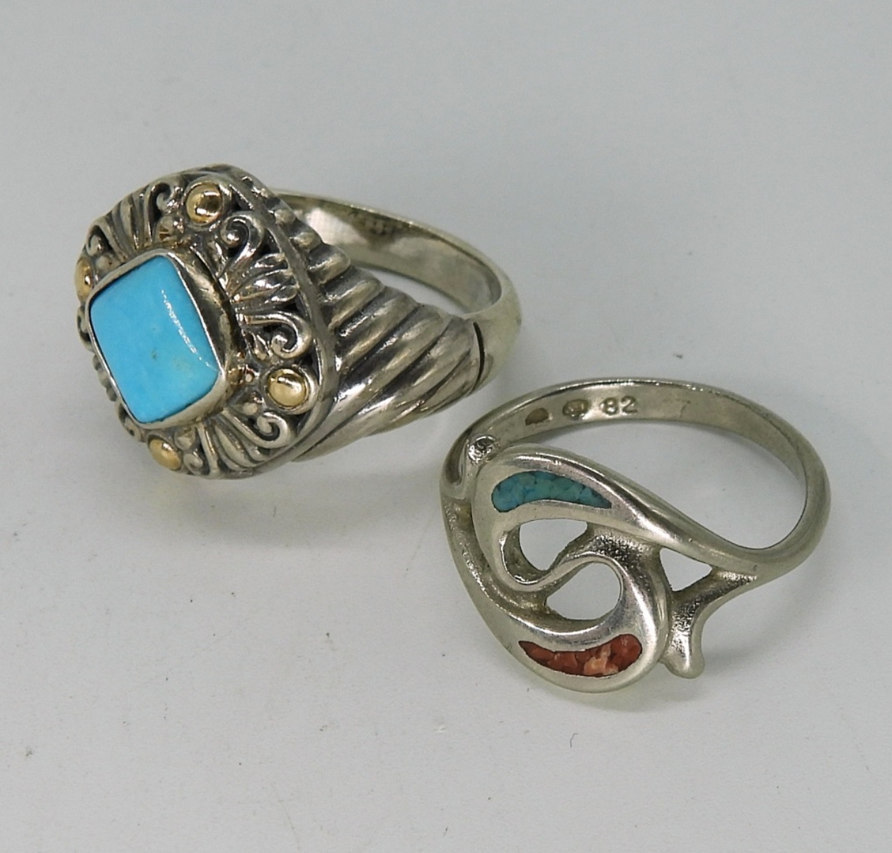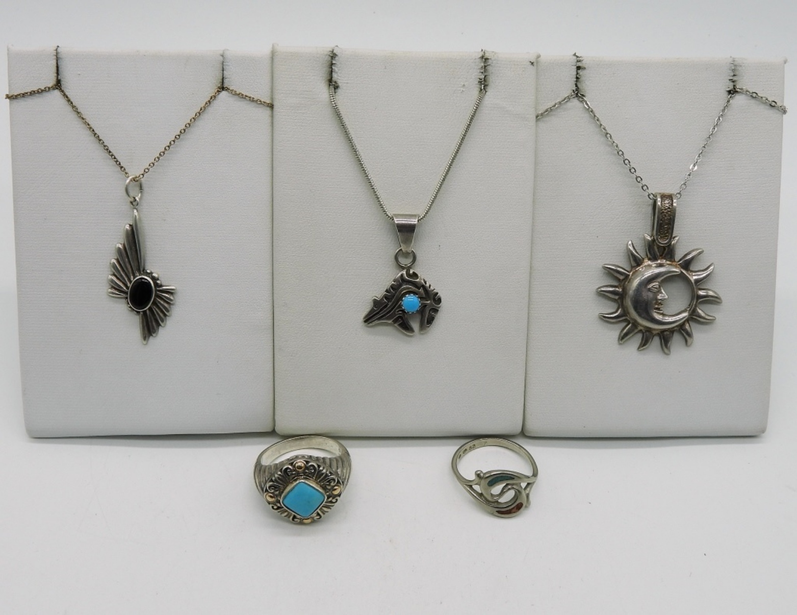 Two sterling rings with turquoise, size 7 & 8. Three sterling necklaces, 16″ & 17″ long. (17 dwt)