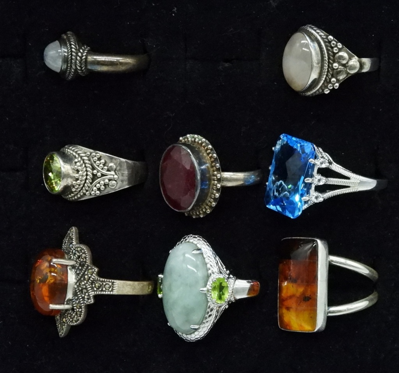 Eight chunky style, sterling gemstone fashion rings. Sizes 7-10. (27 dwt)
