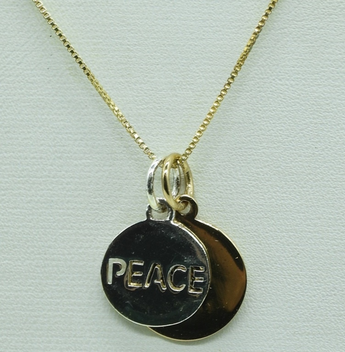 Double pendant, “S” & Peace, gold and silver toned. On a sterling chain with 14kt gold plating. 18″ chain. (2.1 dwt) (6x4x2)
