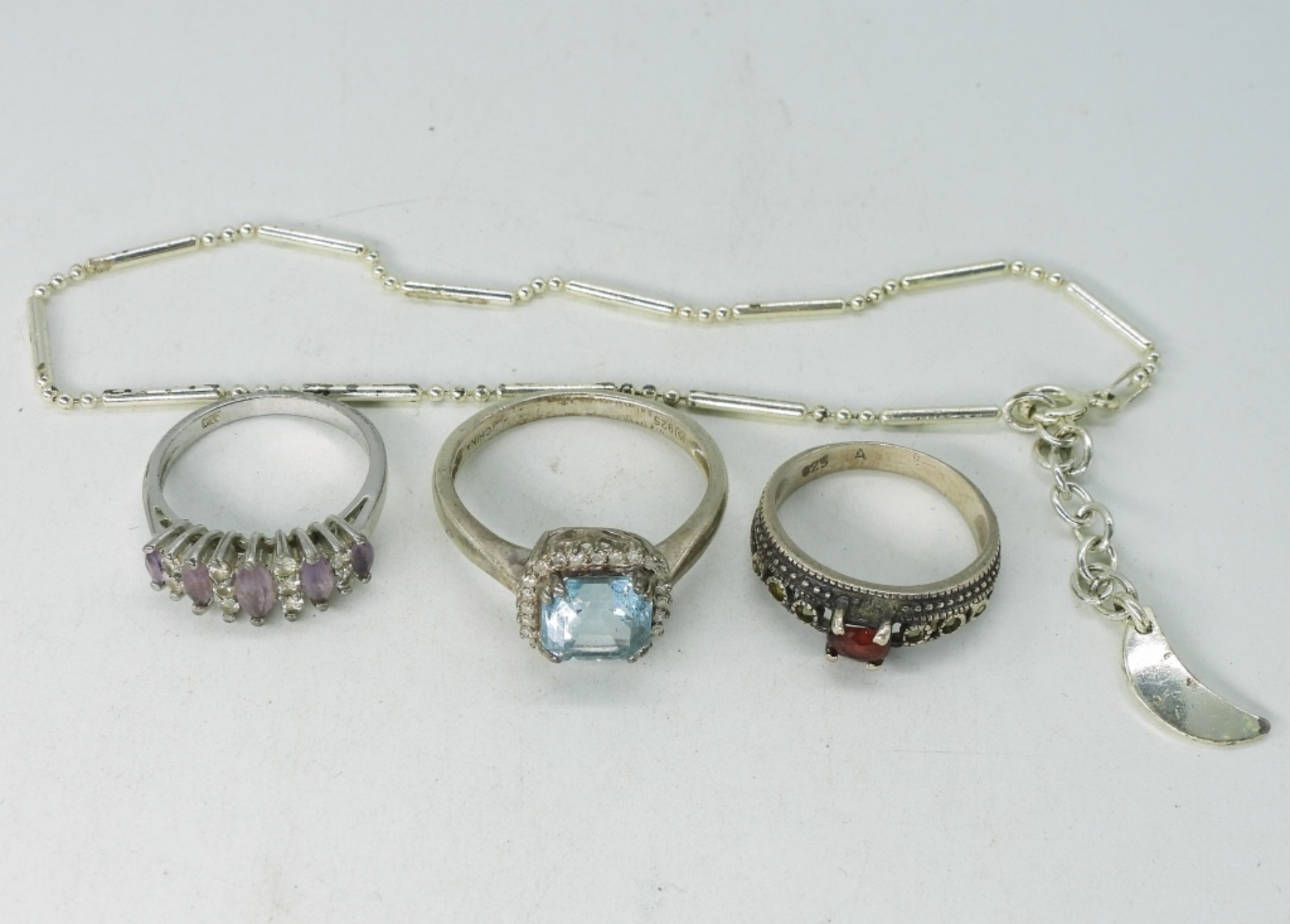 Adorable smokey quartz owl necklace, 18″. Matching moon bracelet / anklet, 8-11″. 3 sterling rings, sizes 6 & 10. (13.3 dwt) (6x4x2)