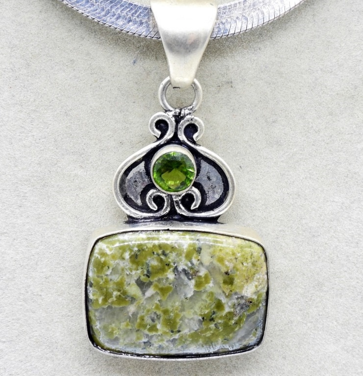 Green Jasper & Peridot Sterling Charm, 2″. Sterling herringbone chain, 20″. (17.2 dwt) (6x4x2)