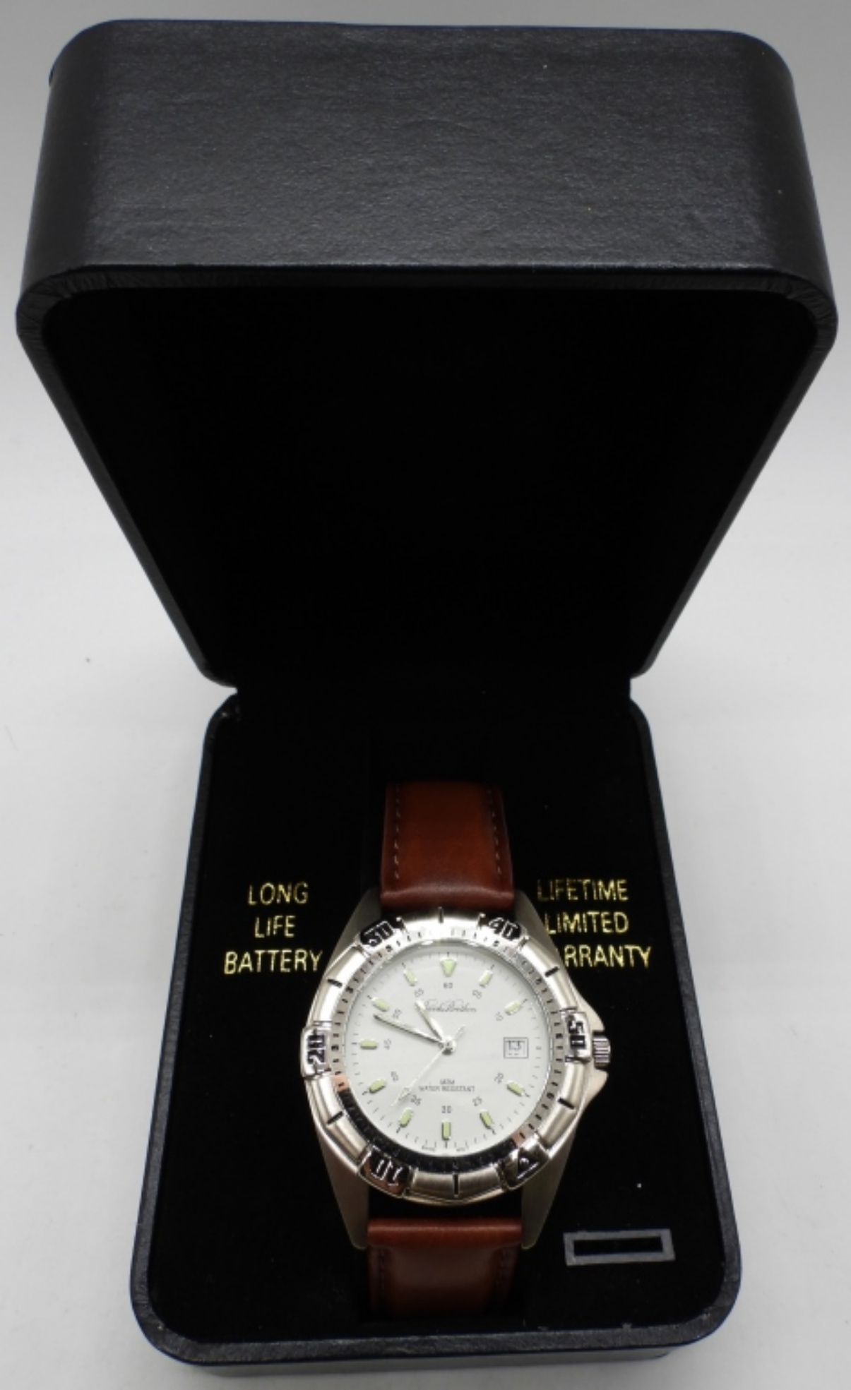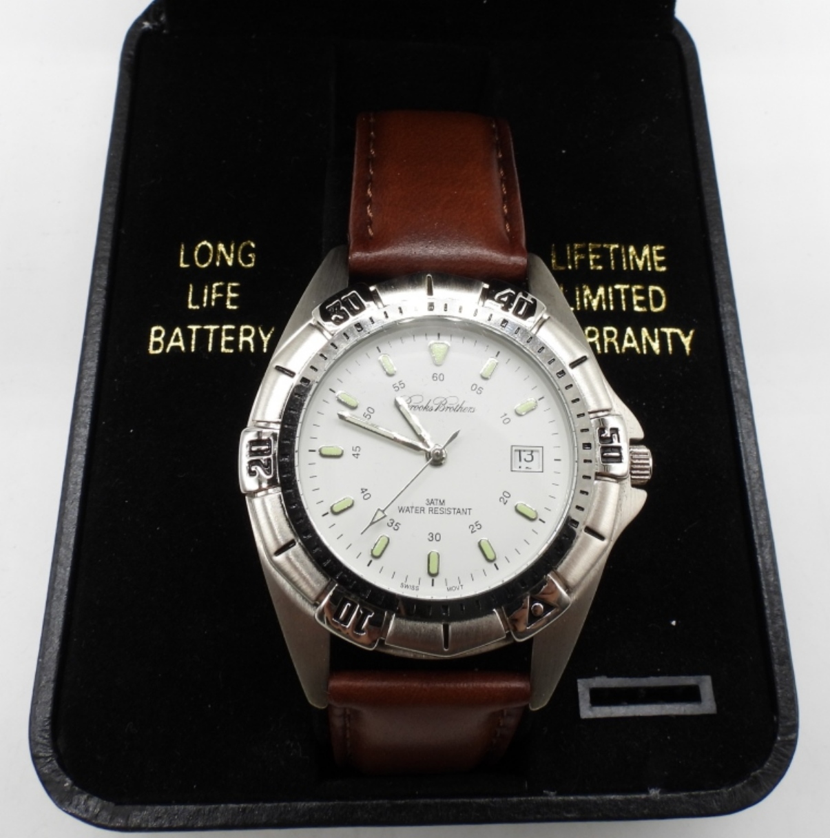 water resistant with glow in the dark, genuine leather brown band, stainless steel back, Swiss movement, great condition, in box, watches are not verified, authenticated, or tested in running condition unless