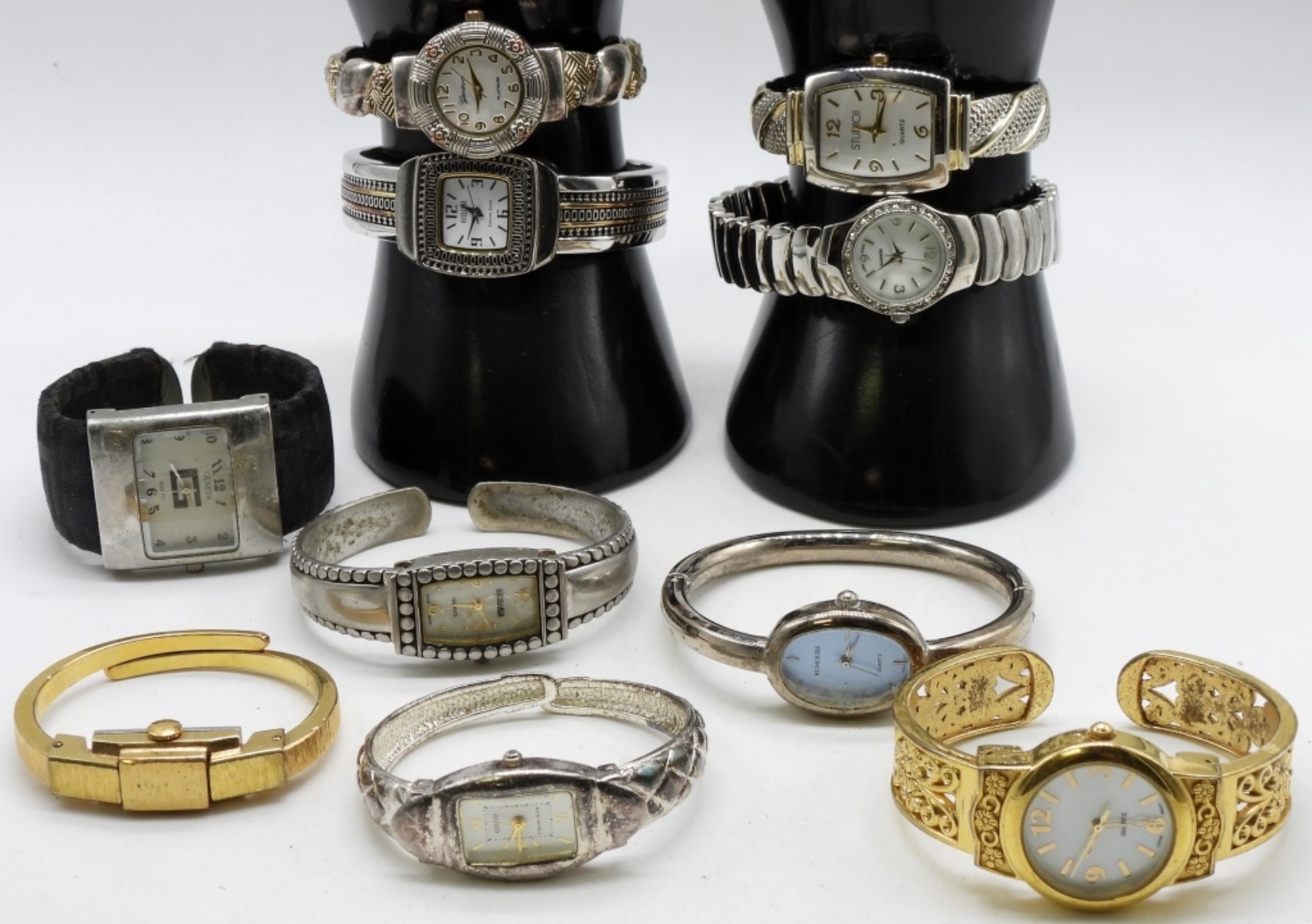 Sliver-tone, Gold-tone cuff watches. Watches are not verified, authenticated, or tested in running condition unless specified.