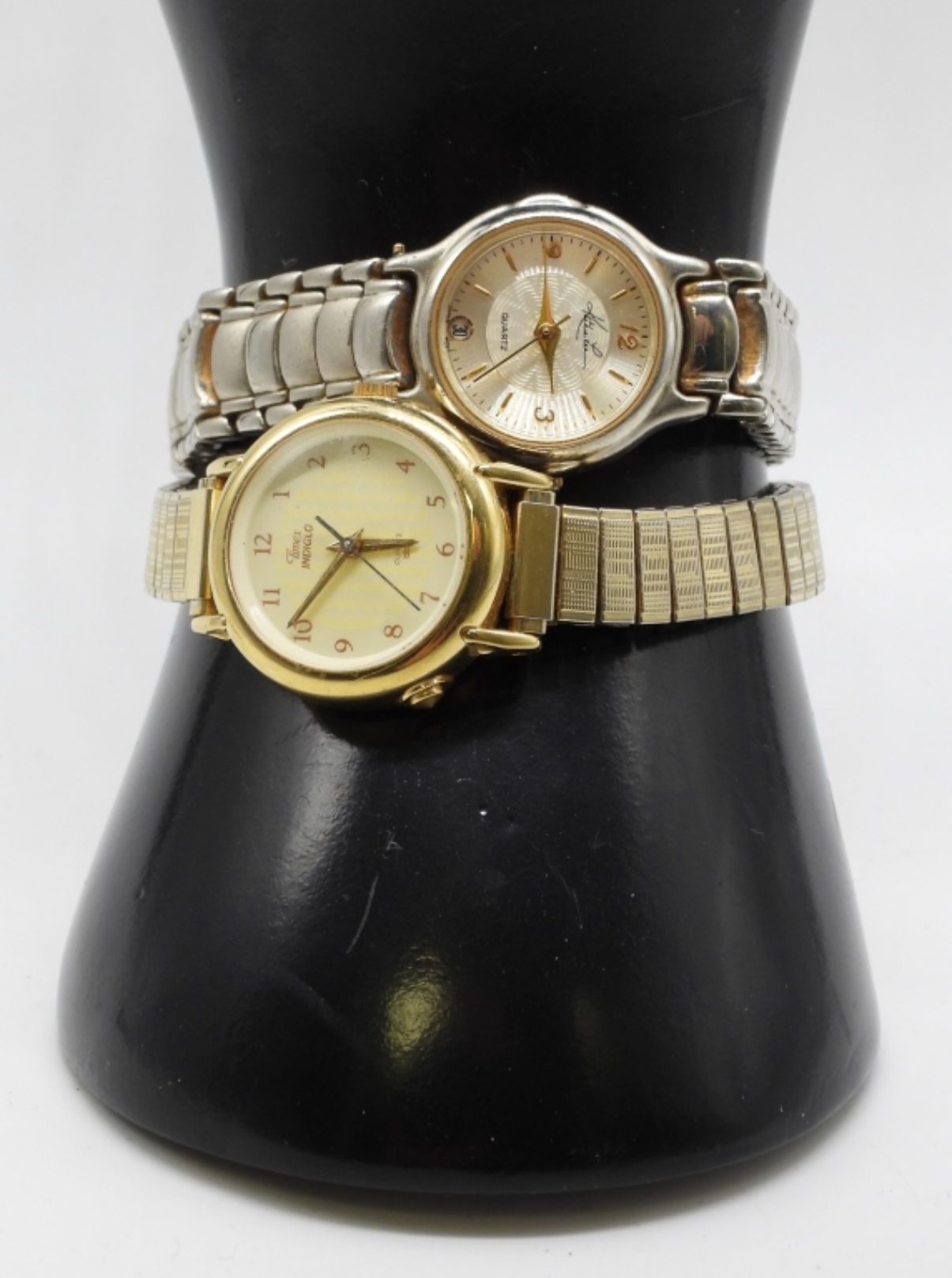 1) Kathy Ireland silver-tone. With a clasp. 2) Timex Indiglo gold-tone with stretch band. Watches are not verified, authenticated, or tested in running condition unless specified