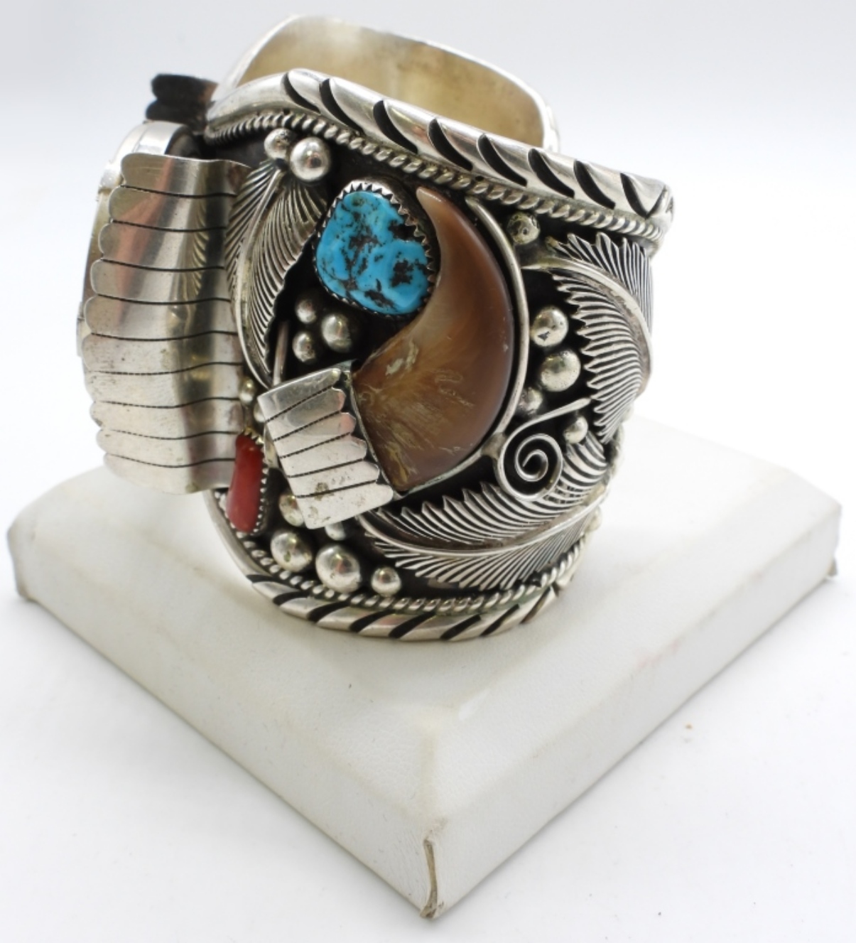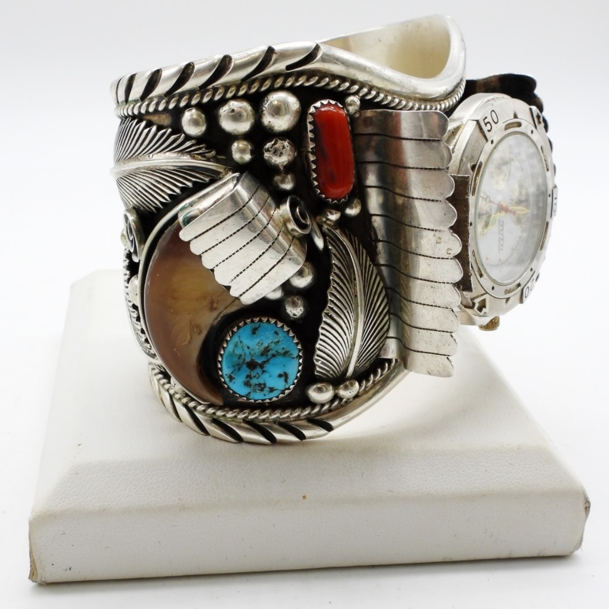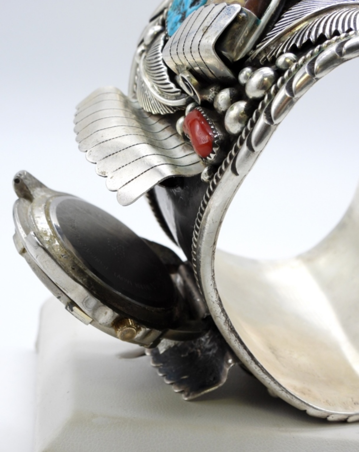 Sterling Navajo watch cuff. It is stamped sterling inside the cuff. About 7in with a gap. Does have a watch face that can come off. Coral and Turquoise. Watches are not verified, authenticated, or tested in running