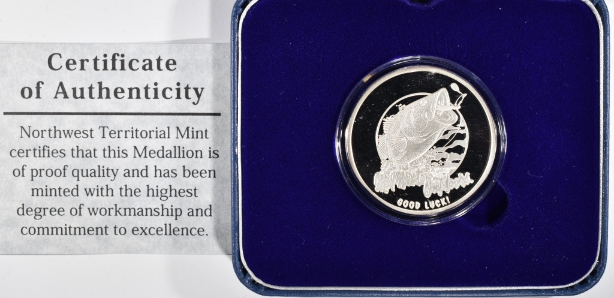 Midwest Outdoors good luck medallion. “Helping people enjoy the outdoors”. In display box with COA Northwest Territorial Mint.