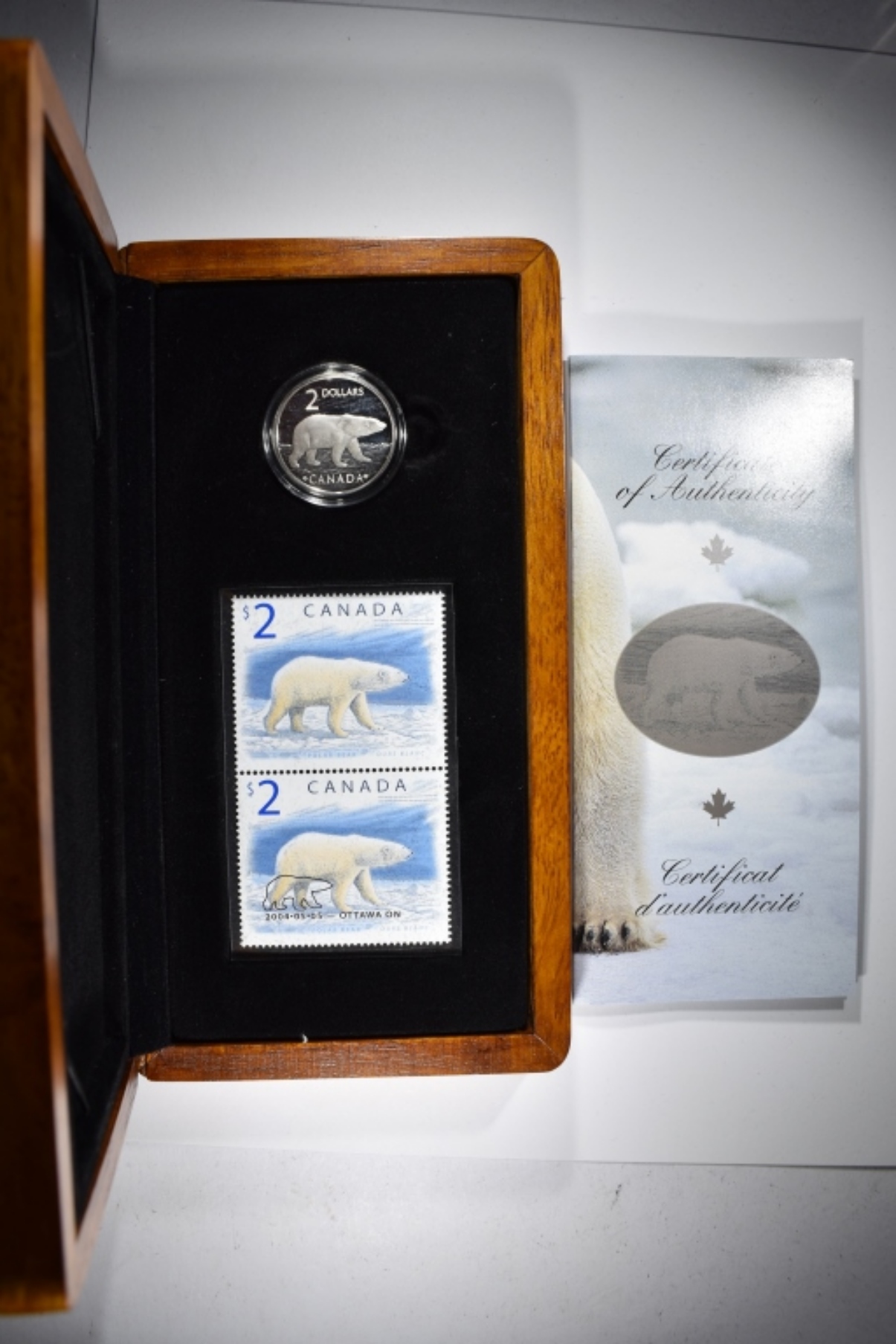 Sterling Silver coin with 2 stamps in nice display box