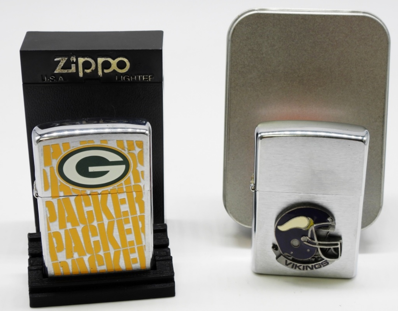 Unfired. Minnesota Vikings and Green Bay Packers Zippos. Both in a box