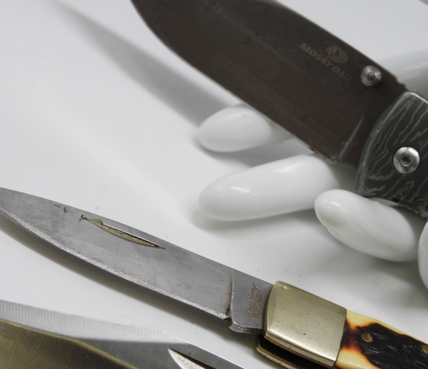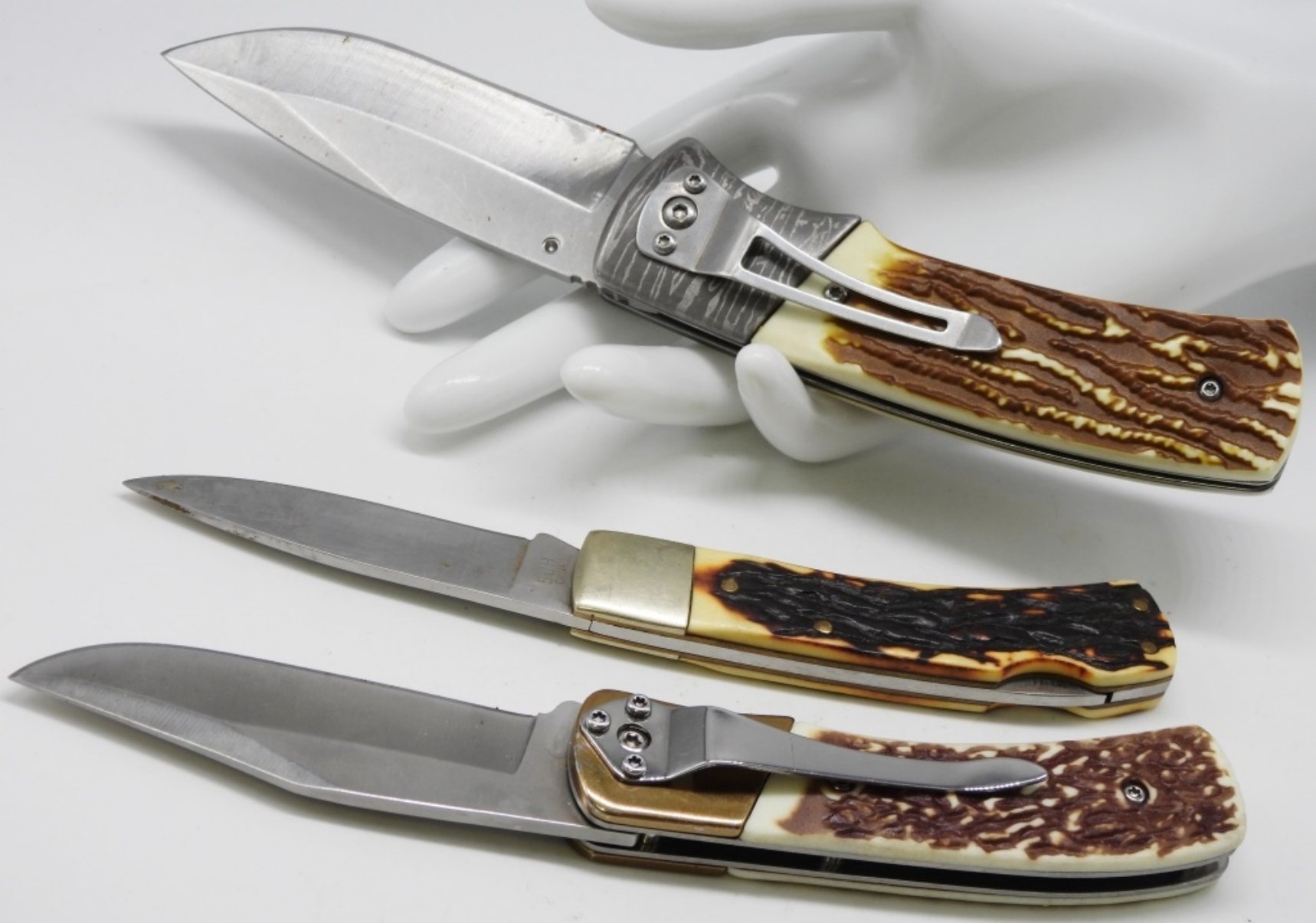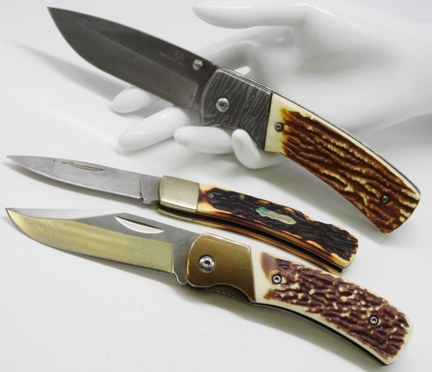 1) Schrade 5UH Uncle Henry. 2) Isn’t marked. It does have a belt clip. 3) Mossy Oak lock-back