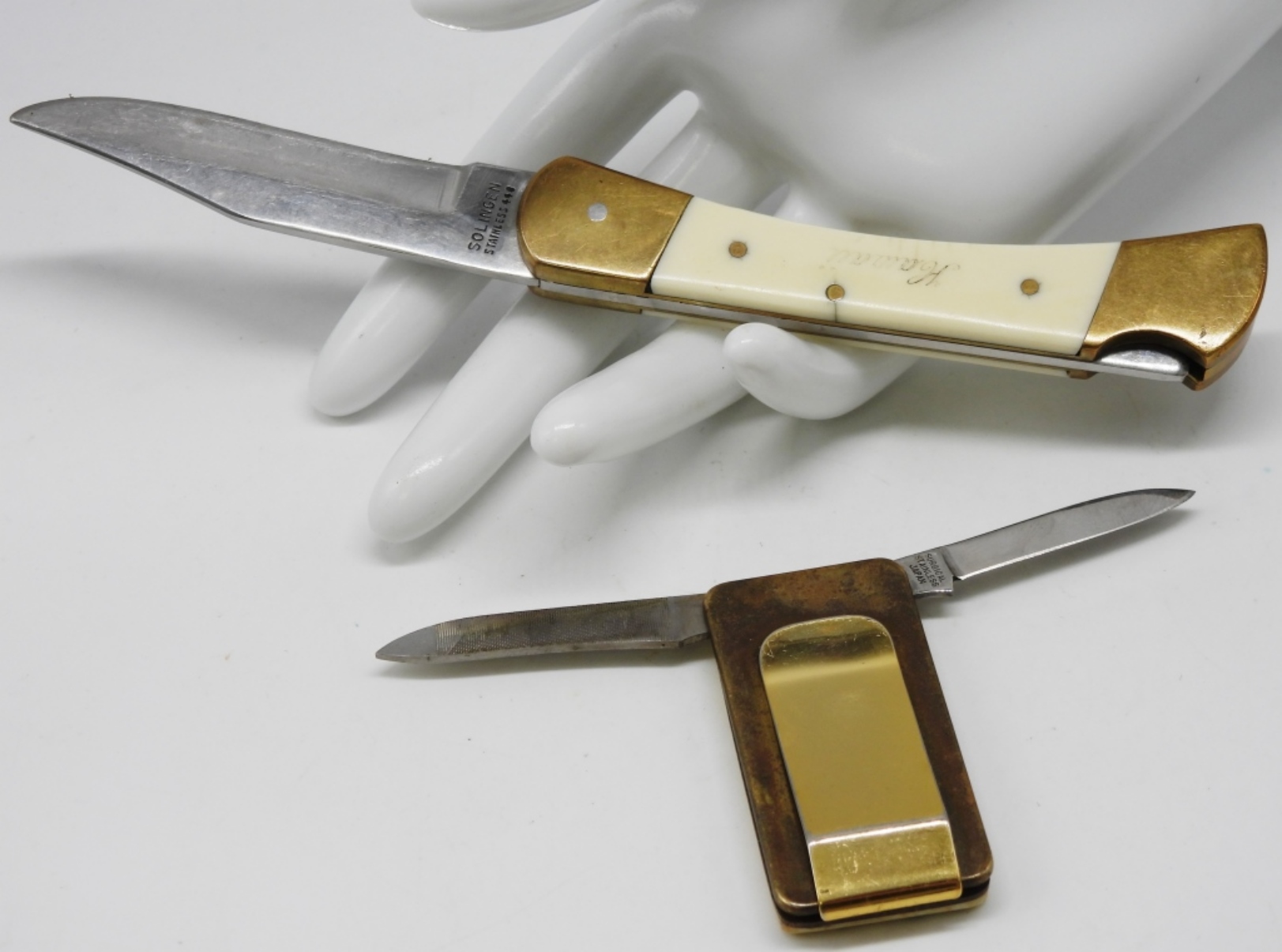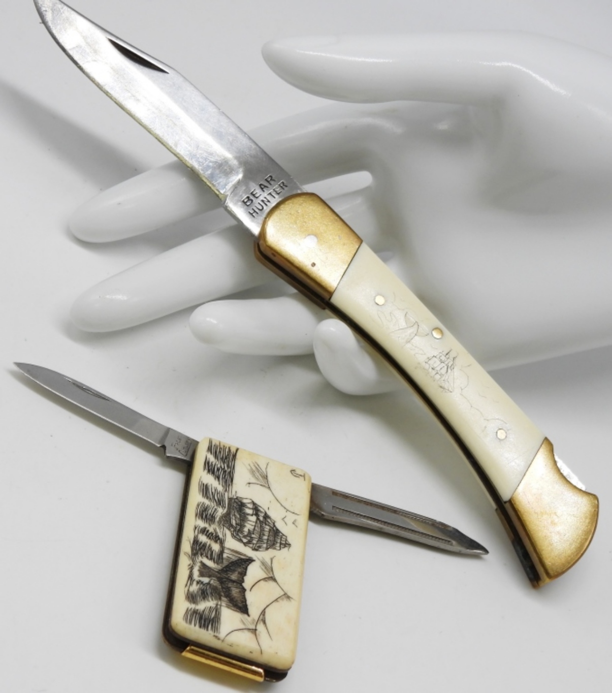 1) One side says Hawaii. Bear Hunter lock-back. 2) Flat utility pocket knife