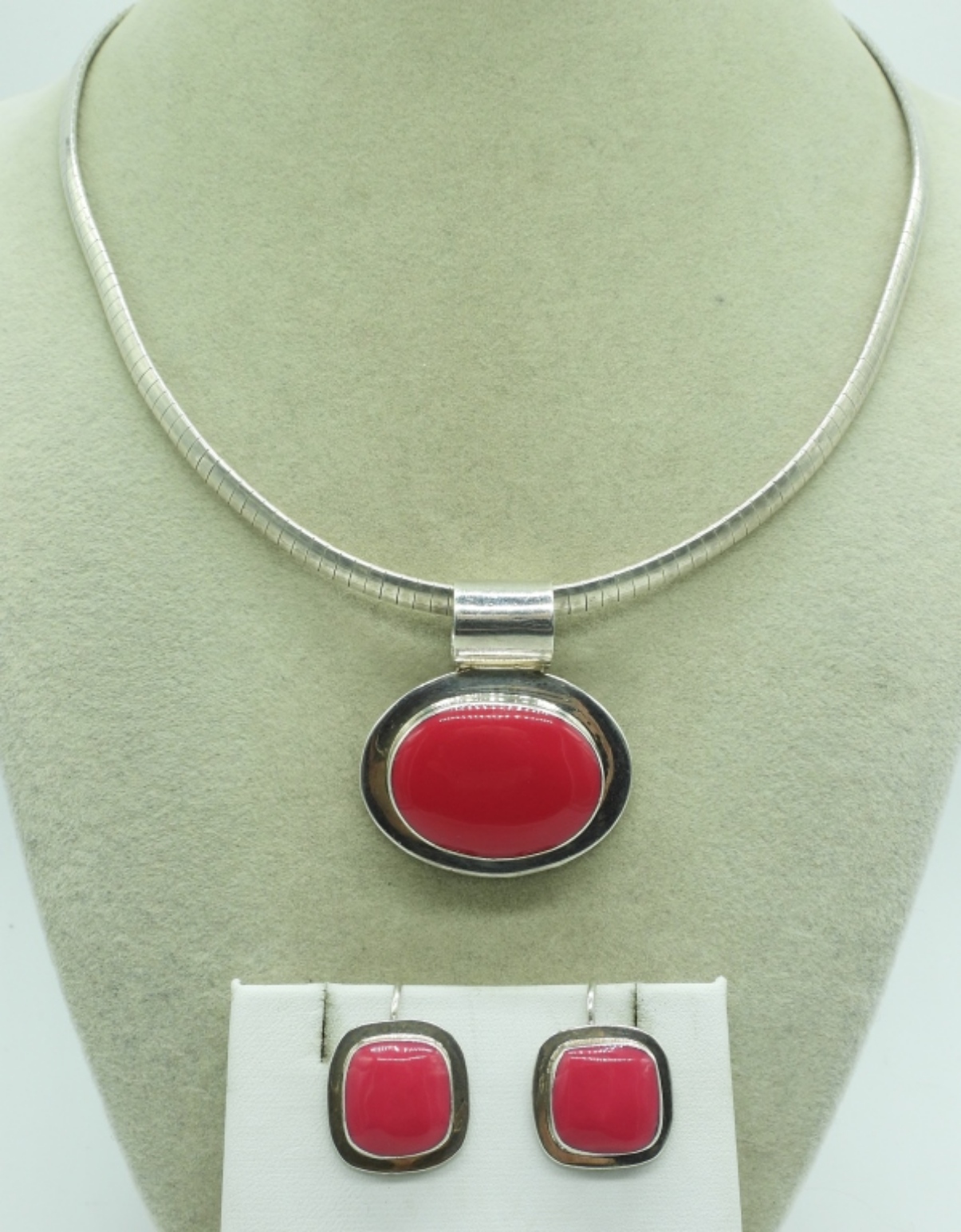 Sterling necklace and pierced earring set. Unidentified pink gemstone. Necklace is 16″ long. Earrings hang 1″ long. (27 dwt)