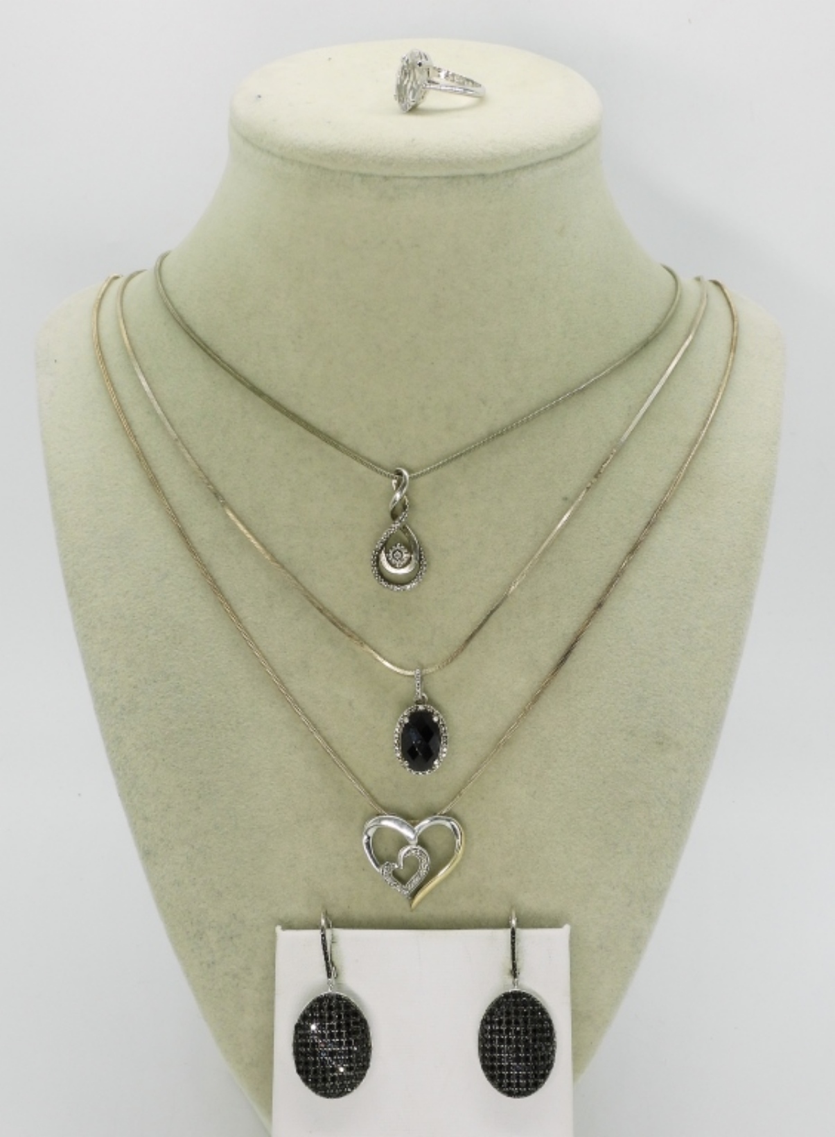 Black spinel 925 pierced earrings, 1.5″ long. Simulated Diamond 925 ring, size 4. Three sterling necklaces, 16″-20″ long sterling chains. (17 dwt)