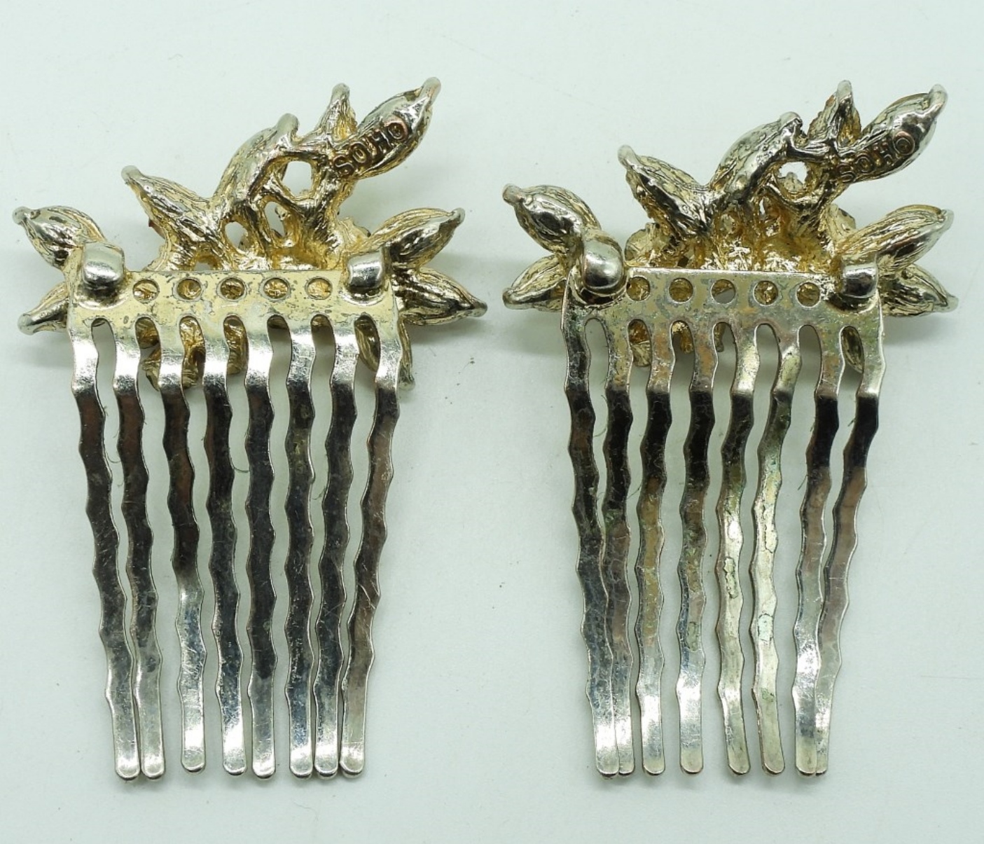 One pair of small sterling, rhinestone hair combs. 2″ long, 1″ wide. (10 dwt)