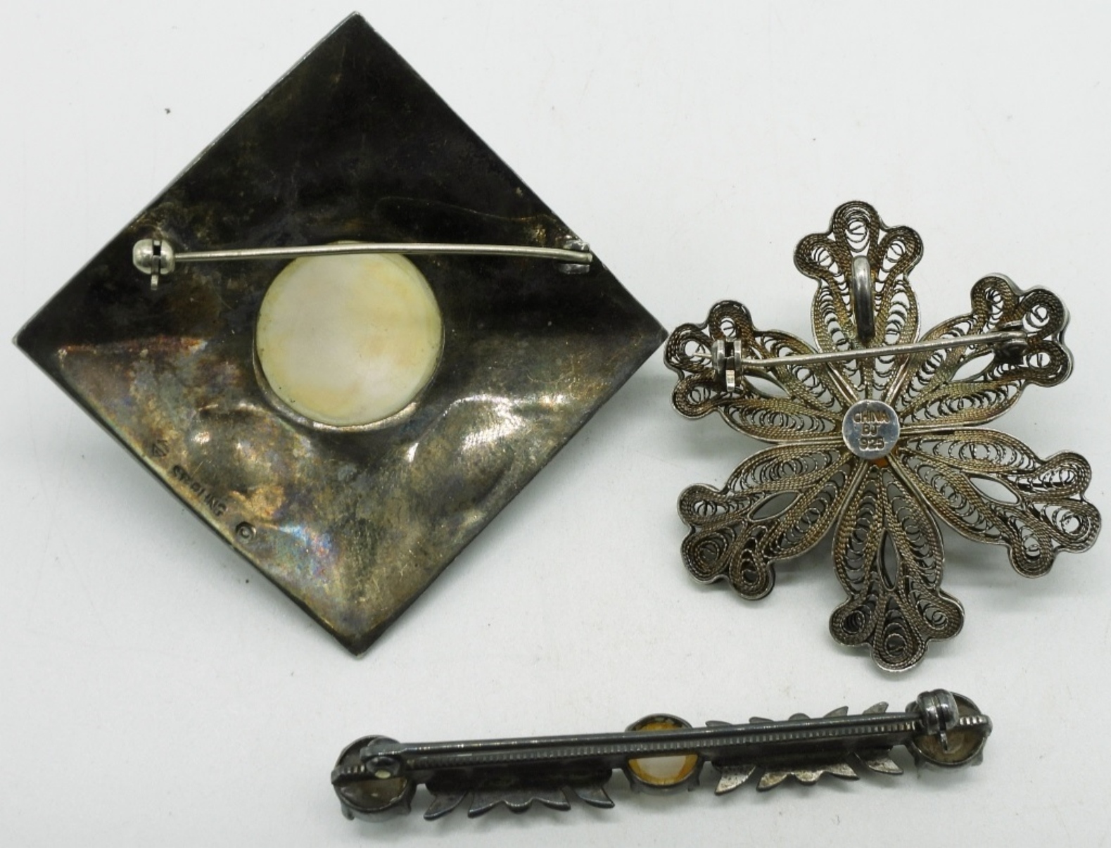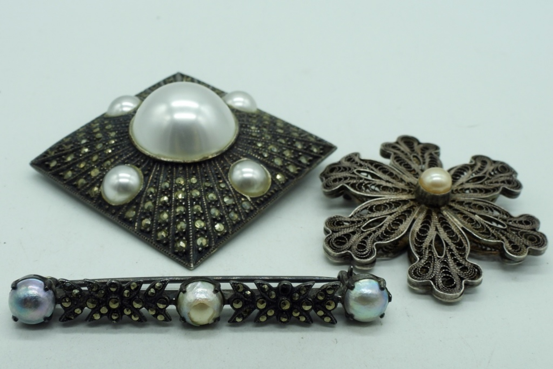 Three sterling brooches with pearl and marcasite accents. 1.5″ – 2.5″. (24 dwt)