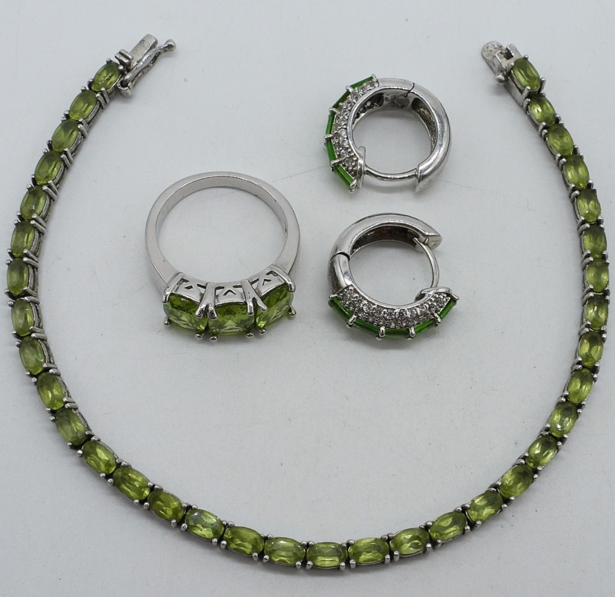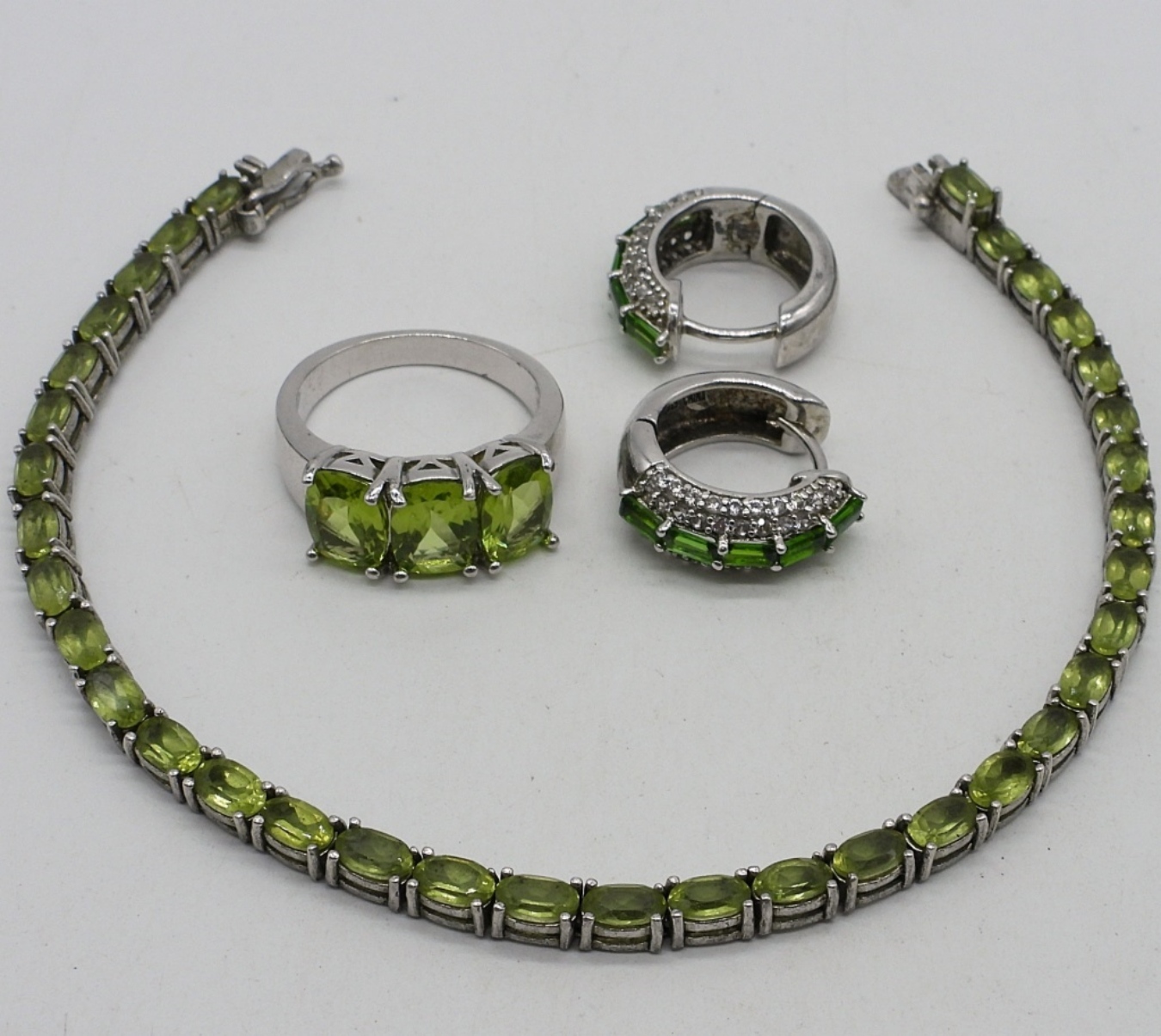 Sterling bracelet, ring and earrings with peridot gemstones. Bracelet, 7.5″ long. Ring size 7. (11.5 dwt)