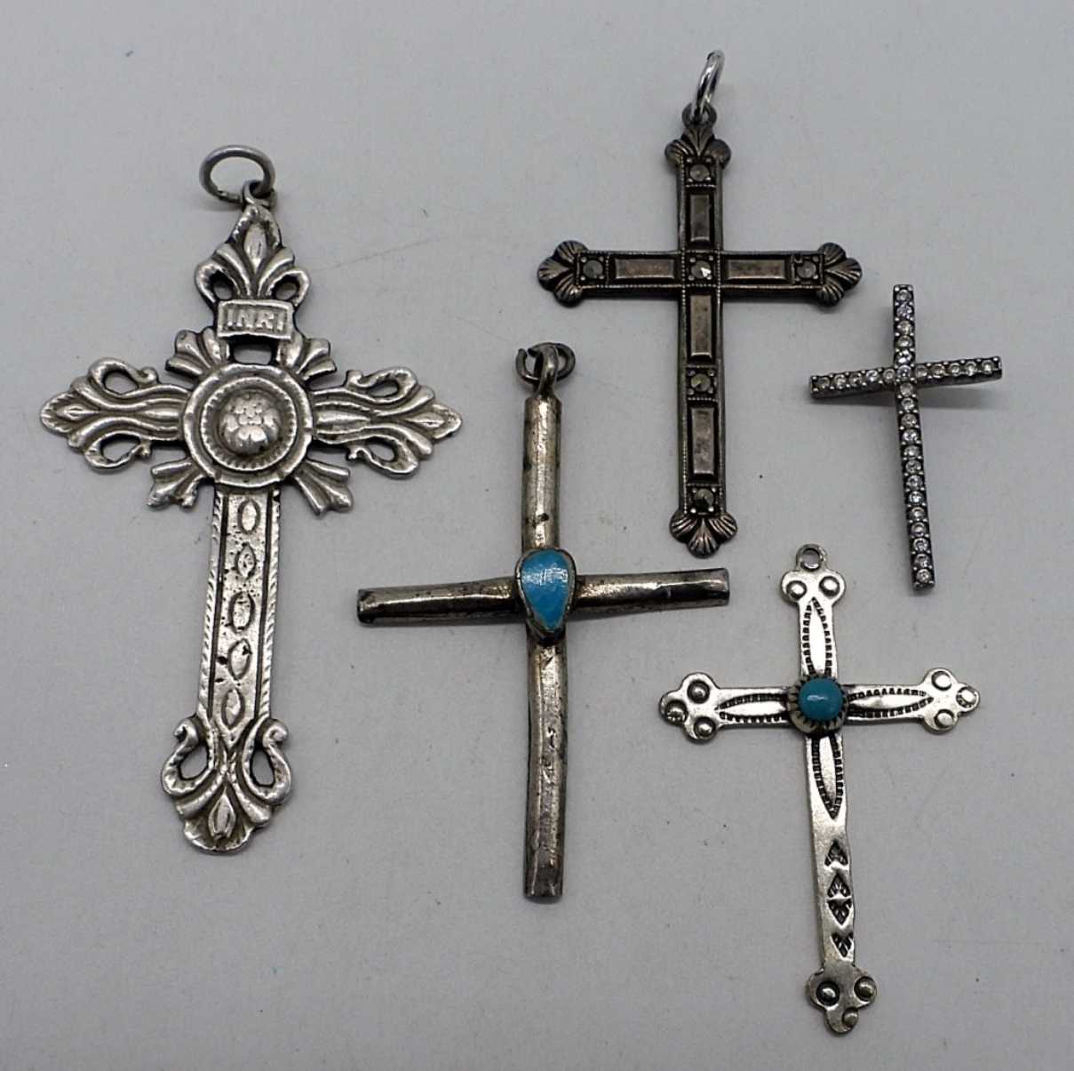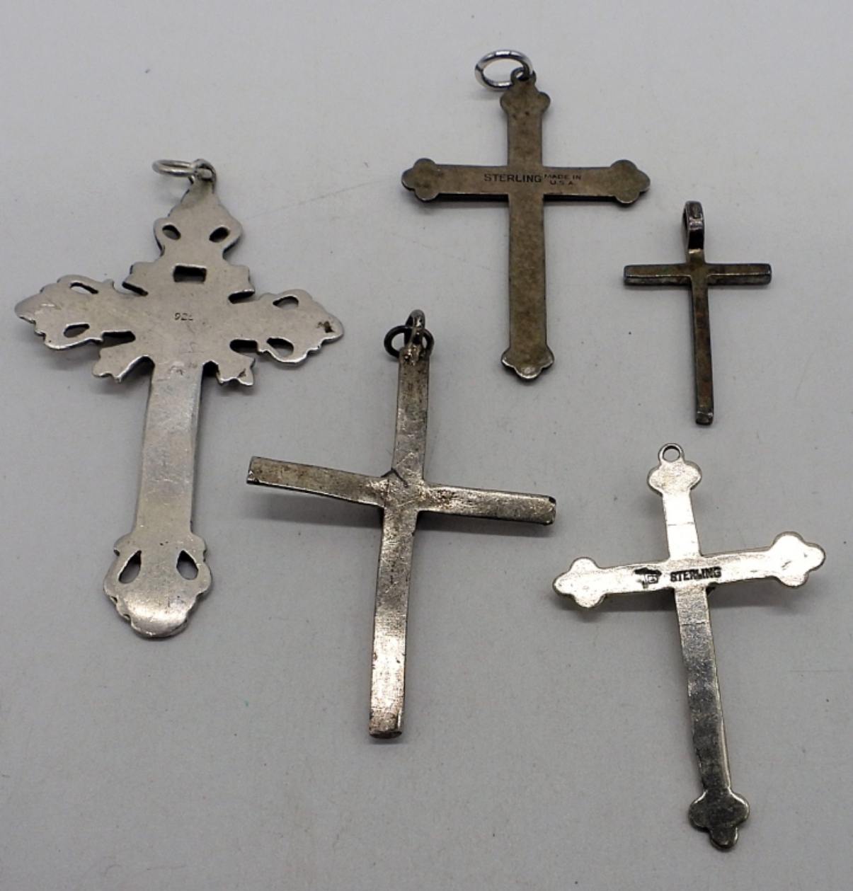Five sterling religious cross pendants. 1″ – 2″ long. (8.7 dwt)